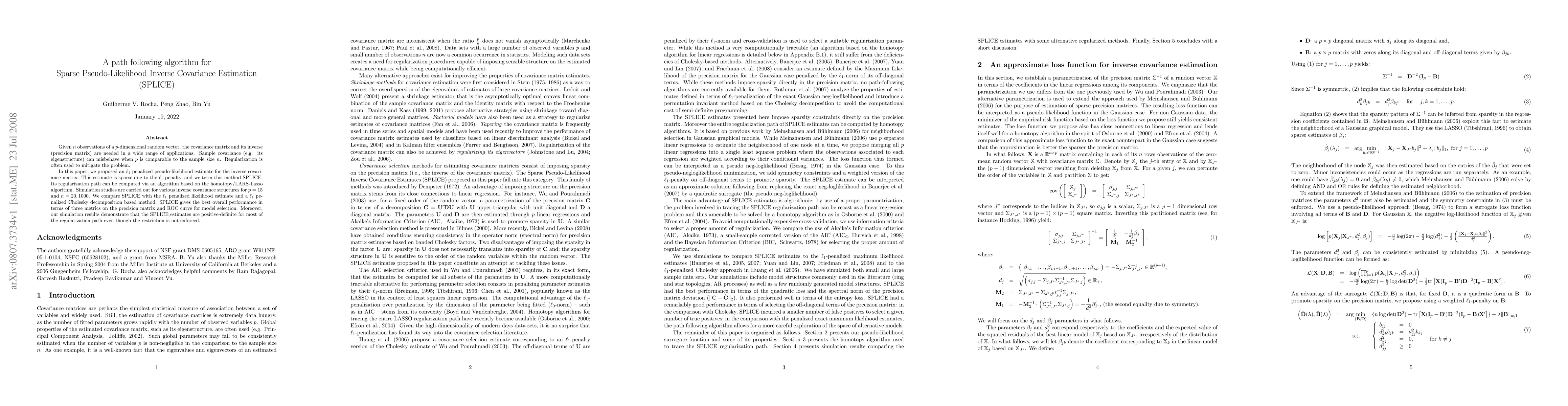 This paper proposes SPLICE, an l1-norm penalized pseudo-likelihood method for sparse inverse covariance estimation, which outperforms competing methods in regularization path computation and model selection accuracy. Simulation results show SPLICE maintains positive-definiteness and superior performance across various scenarios.