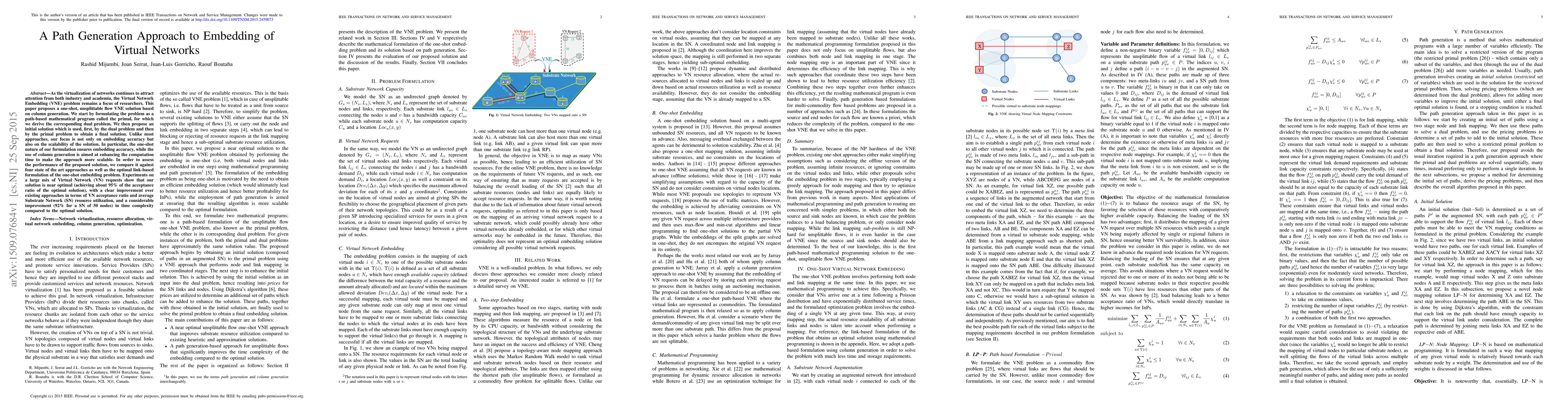 As the virtualization of networks continues to attract attention from both industry and academia, the Virtual Network Embedding (VNE) problem remains a focus of researchers. This paper proposes a one-shot, unsplittable flow VNE solution based on column generation. We start by formulating the problem as a path-based mathematical program called the primal, for which we derive the corresponding dual problem. We then propose an initial solution which is used, first, by the dual problem and then by the primal problem to obtain a final solution. Unlike most approaches, our focus is not only on embedding accuracy but also on the scalability of the solution. In particular, the one-shot nature of our formulation ensures embedding accuracy, while the use of column generation is aimed at enhancing the computation time to make the approach more scalable. In order to assess the performance of the proposed solution, we compare it against four state of the art approaches as well as the optimal link-based formulation of the one-shot embedding problem. Experiments on a large mix of Virtual Network (VN) requests show that our solution is near optimal (achieving about 95% of the acceptance ratio of the optimal solution), with a clear improvement over existing approaches in terms of VN acceptance ratio and average Substrate Network (SN) resource utilization, and a considerable improvement (92% for a SN of 50 nodes) in time complexity compared to the optimal solution.