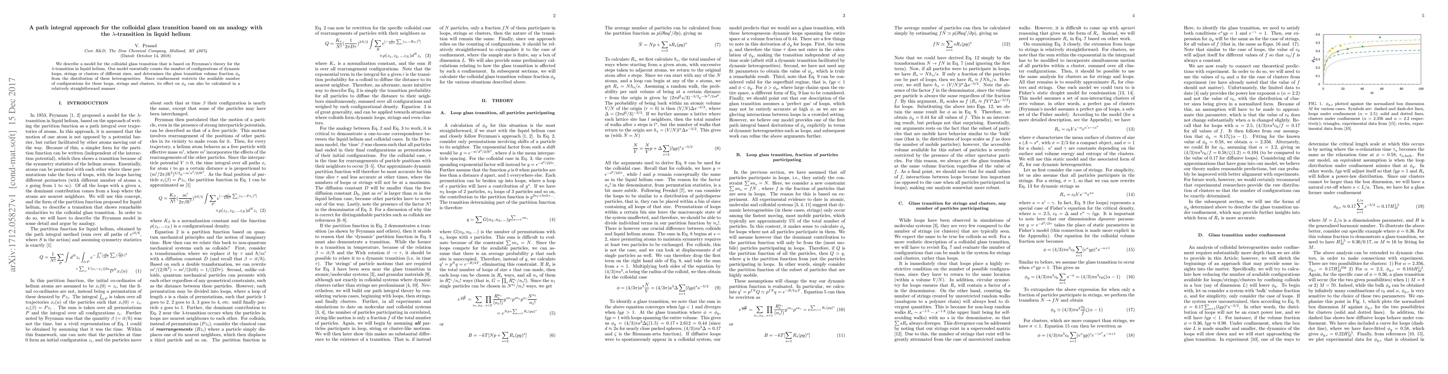 We describe a model for the colloidal glass transition that is based on Feynman's theory for the $\lambda$-transition in liquid helium. Our model essentially counts the number of configurations of dynamic loops, strings or clusters of different sizes, and determines the glass transition volume fraction $\phi_{g}$ from the distribution of these heterogeneities. Since confinement restricts the available number of configurations for these loops, strings and clusters, its effect on $\phi_{g}$ can also be calculated in a relatively straightforward manner.