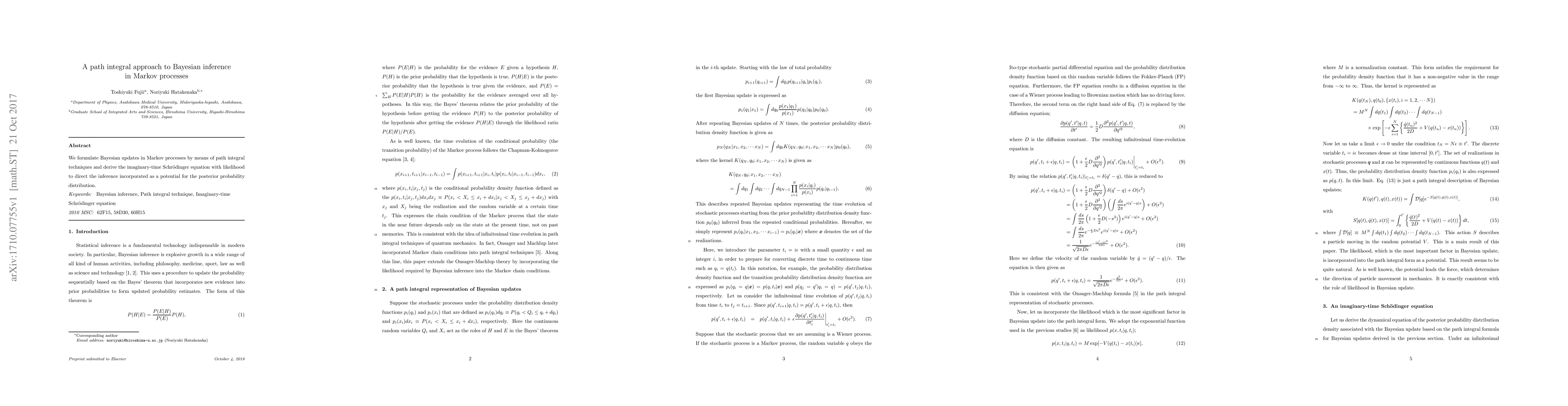 This paper employs path integral methods to reformulate Bayesian inference in Markov processes, deriving an imaginary-time Schrödinger equation where the likelihood function acts as a potential guiding the posterior probability distribution. The approach provides a novel framework for updating beliefs in dynamic systems.