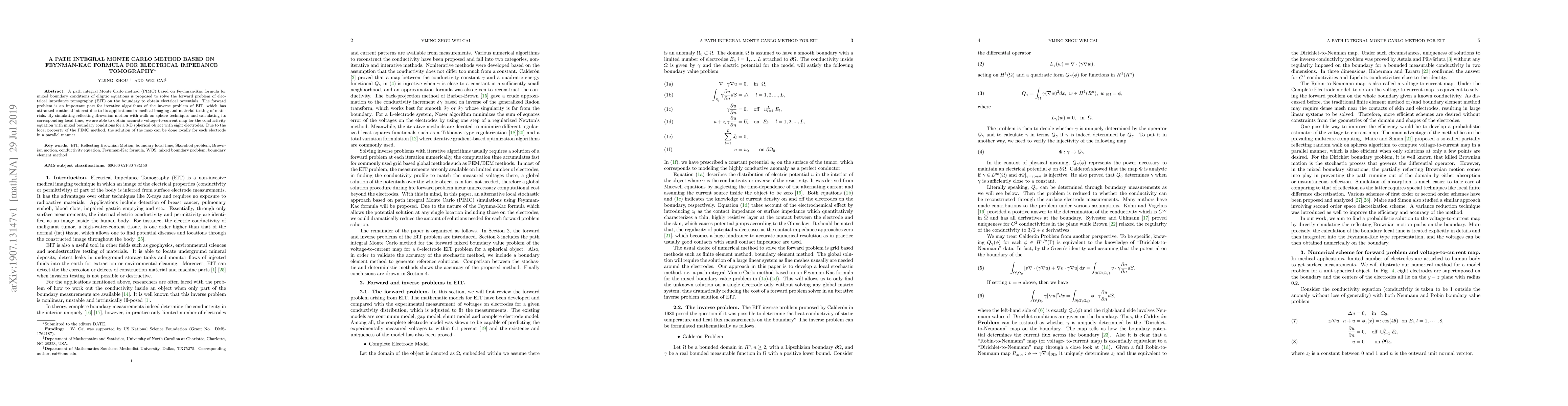 This paper proposes a path integral Monte Carlo method based on the Feynman-Kac formula to solve the forward problem of electrical impedance tomography (EIT) for mixed boundary conditions. The method accurately maps voltage to current for a 3-D spherical object using reflecting Brownian motion, enabling parallel computation for each electrode.