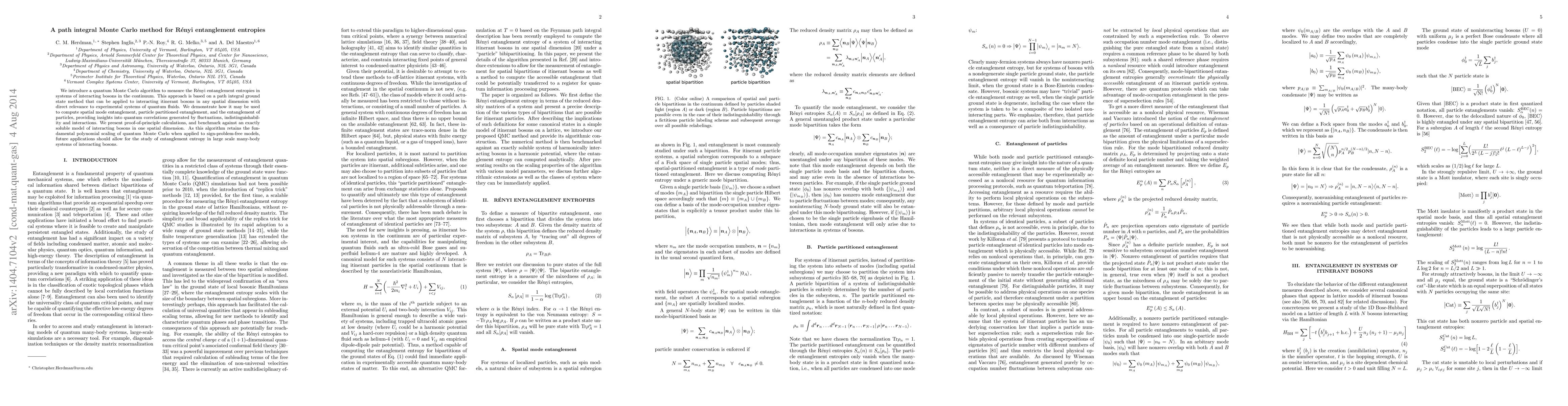This paper introduces a quantum Monte Carlo method for measuring Rényi entanglement entropies in systems of interacting bosons, demonstrating its application to various entanglement types and benchmarking against a soluble model. The method retains polynomial scaling, promising future studies of entanglement in large-scale quantum fluid systems.