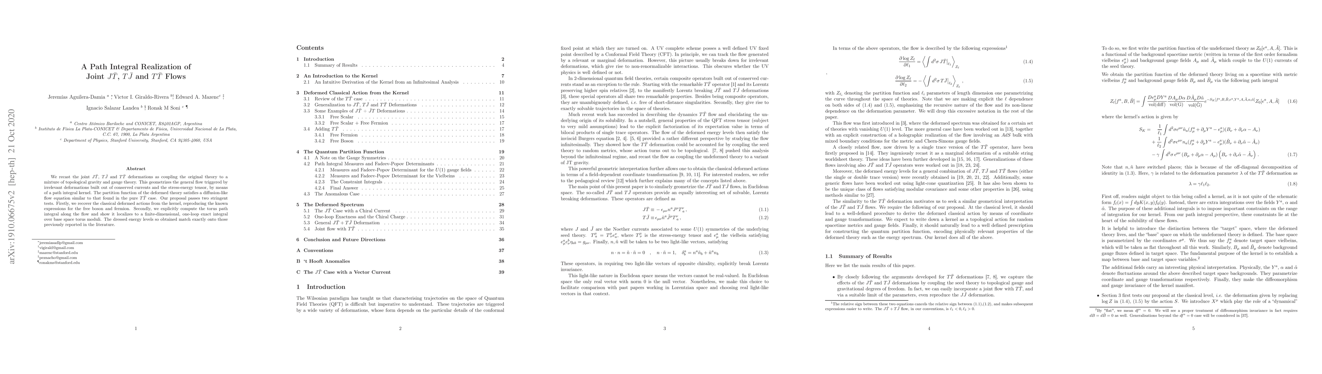 We recast the joint $J\bar{T}$, $T\bar{J}$ and $T\bar{T}$ deformations as coupling the original theory to a mixture of topological gravity and gauge theory. This geometrizes the general flow triggered by irrelevant deformations built out of conserved currents and the stress-energy tensor, by means of a path integral kernel. The partition function of the deformed theory satisfies a diffusion-like flow equation similar to that found in the pure $T\bar{T}$ case. Our proposal passes two stringent tests. Firstly, we recover the classical deformed actions from the kernel, reproducing the known expressions for the free boson and fermion. Secondly, we explicitly compute the torus path integral along the flow and show it localizes to a finite-dimensional, one-loop exact integral over base space torus moduli. The dressed energy levels so obtained match exactly onto those previously reported in the literature.