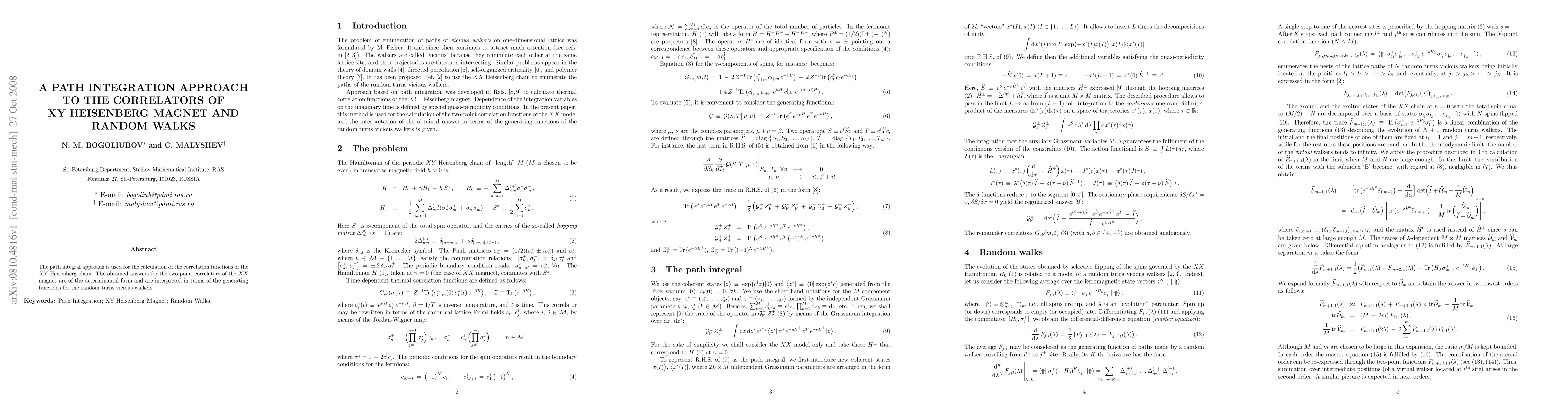 Summary: This paper employs a path integral method to calculate correlation functions of the XY Heisenberg chain, revealing determinantal forms for two-point correlators of the XX magnet, which are interpreted as generating functions for random walks of vicious walkers.