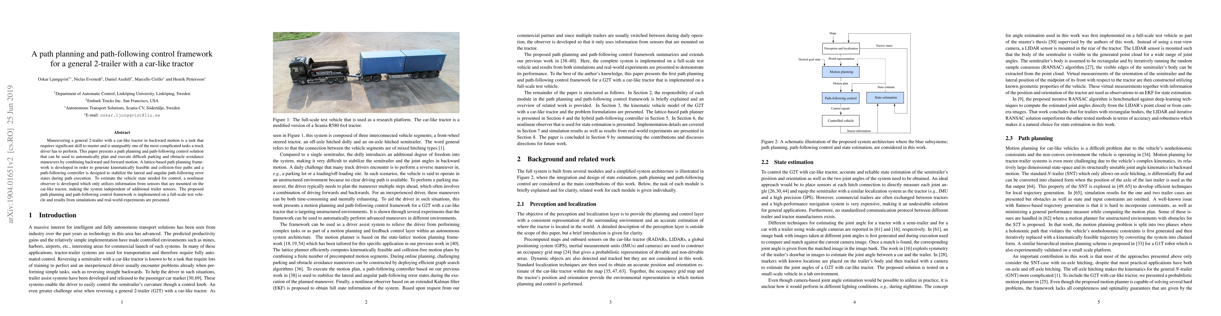 This paper develops a path planning and path-following control framework for maneuvering a 2-trailer with a car-like tractor, combining backward and forward motion for complex parking and obstacle avoidance. The framework includes a lattice-based path planner and a path-following controller, with a nonlinear observer for state estimation, and is validated through simulations and real-world experiments.