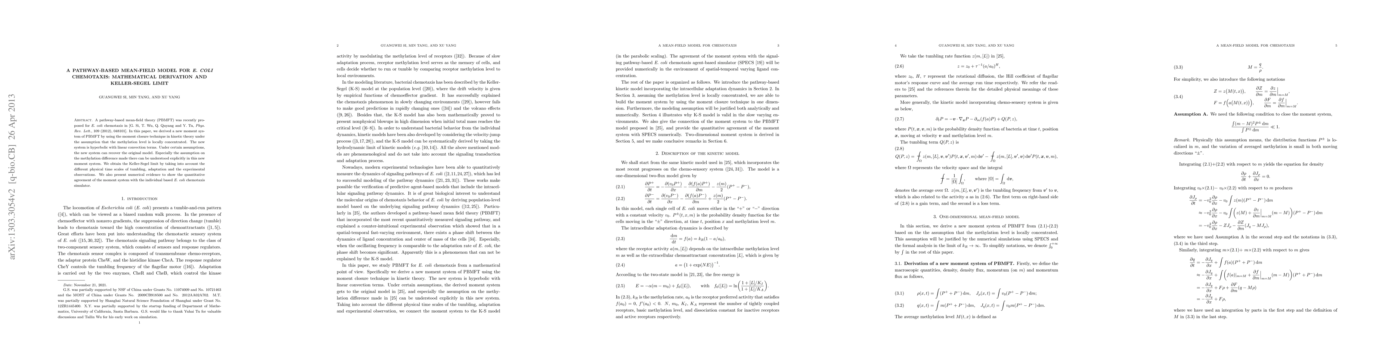 A pathway-based mean-field theory (PBMFT) was recently proposed for E. coli chemotaxis in [G. Si, T. Wu, Q. Quyang and Y. Tu, Phys. Rev. Lett., 109 (2012), 048101]. In this paper, we derived a new moment system of PBMFT by using the moment closure technique in kinetic theory under the assumption that the methylation level is locally concentrated. The new system is hyperbolic with linear convection terms. Under certain assumptions, the new system can recover the original model. Especially the assumption on the methylation difference made there can be understood explicitly in this new moment system. We obtain the Keller-Segel limit by taking into account the different physical time scales of tumbling, adaptation and the experimental observations. We also present numerical evidence to show the quantitative agreement of the moment system with the individual based E. coli chemotaxis simulator.