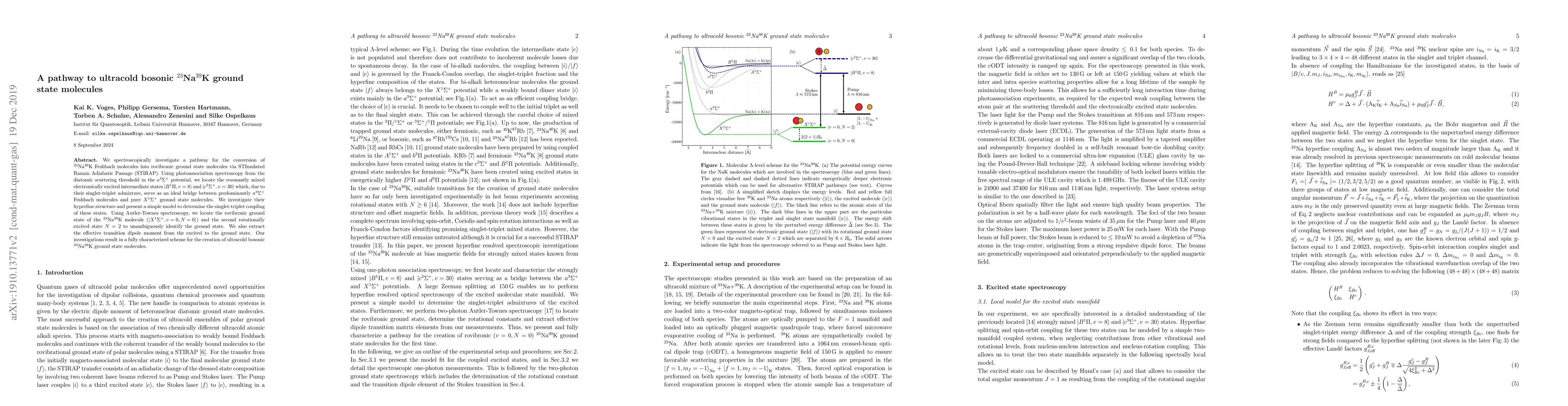 We spectroscopically investigate a pathway for the conversion of $^{23}\textrm{Na}^{39}\textrm{K}$ Feshbach molecules into rovibronic ground state molecules via STImulated Raman Adiabatic Passage (STIRAP). Using photoassociation spectroscopy from the diatomic scattering threshold in the $a^3\Sigma^+$ potential, we locate the resonantly mixed electronically excited intermediate states $|B^1\Pi, v=8\rangle$ and $|c^3\Sigma^+, v=30\rangle$ which, due to their singlet-triplet admixture, serve as an ideal bridge between predominantly $a^3\Sigma^+$ Feshbach molecules and pure $X^1\Sigma^+$ ground state molecules. We investigate their hyperfine structure and present a simple model to determine the singlet-triplet coupling of these states. Using Autler-Townes spectroscopy, we locate the rovibronic ground state of the $^{23}\textrm{Na}^{39}\textrm{K}$ molecule ($|X^1\Sigma^+, v=0, N=0\rangle$) and the second rotationally excited state $N=2$ to unambiguously identify the ground state. We also extract the effective transition dipole moment from the excited to the ground state. Our investigations result in a fully characterized scheme for the creation of ultracold bosonic $^{23}\textrm{Na}^{39}\textrm{K}$ ground state molecules.