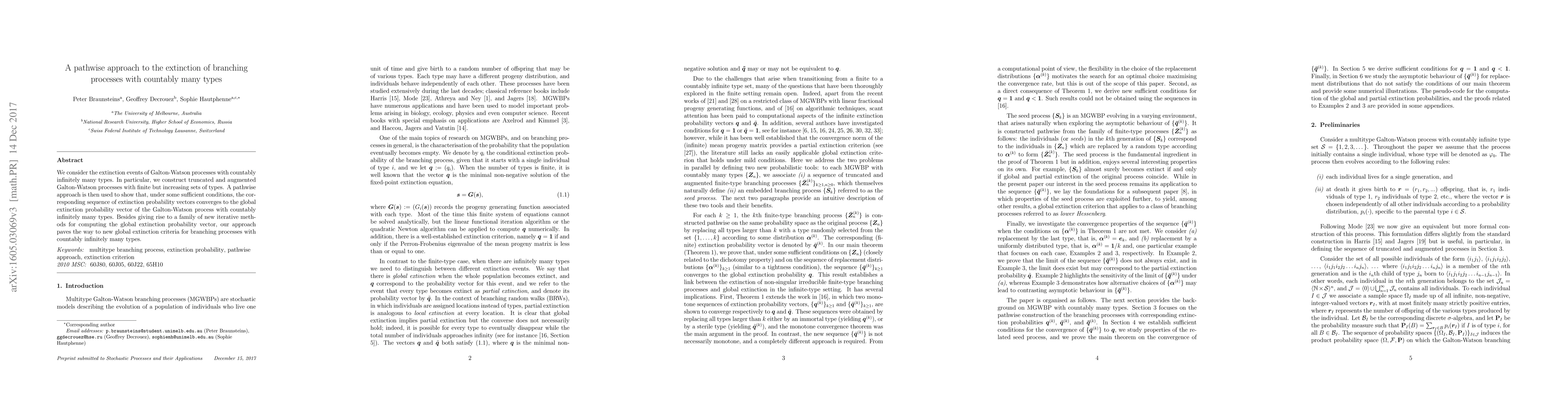 This paper develops a pathwise iterative method to determine the extinction probability in Galton-Watson processes with countably many types. It constructs truncated processes and shows convergence of their extinction probability vectors to the global extinction probability under certain conditions.