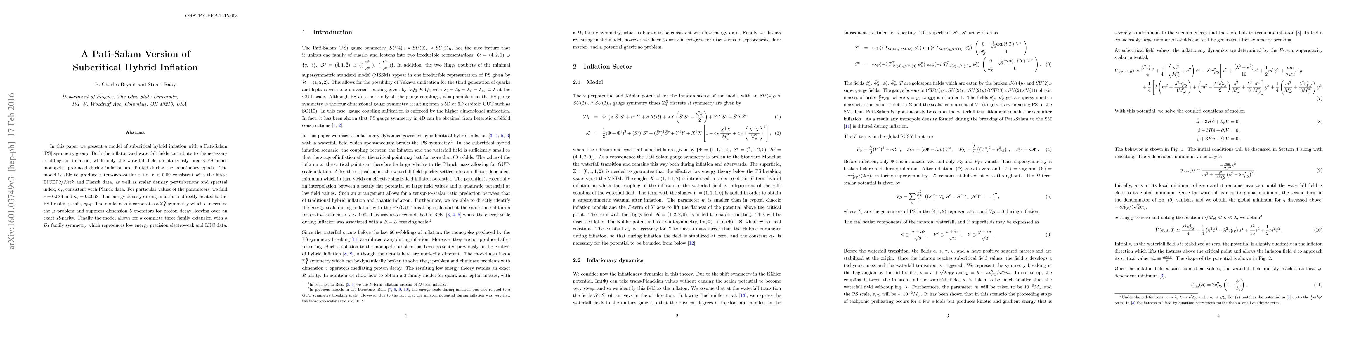 In this paper we present a model of subcritical hybrid inflation with a Pati-Salam [PS] symmetry group. Both the inflaton and waterfall fields contribute to the necessary e-foldings of inflation, while only the waterfall field spontaneously breaks PS hence monopoles produced during inflation are diluted during the inflationary epoch. The model is able to produce a tensor-to-scalar ratio, $r < 0.09$ consistent with the latest BICEP2/Keck and Planck data, as well as scalar density perturbations and spectral index, $n_s$, consistent with Planck data. For particular values of the parameters, we find $r = 0.084$ and $n_s = 0.0963$. The energy density during inflation is directly related to the PS breaking scale, $v_{PS}$. The model also incorporates a $\mathbb{Z}_4^R$ symmetry which can resolve the $\mu$ problem and suppress dimension 5 operators for proton decay, leaving over an exact $R$-parity. Finally the model allows for a complete three family extension with a $D_4$ family symmetry which reproduces low energy precision electroweak and LHC data.