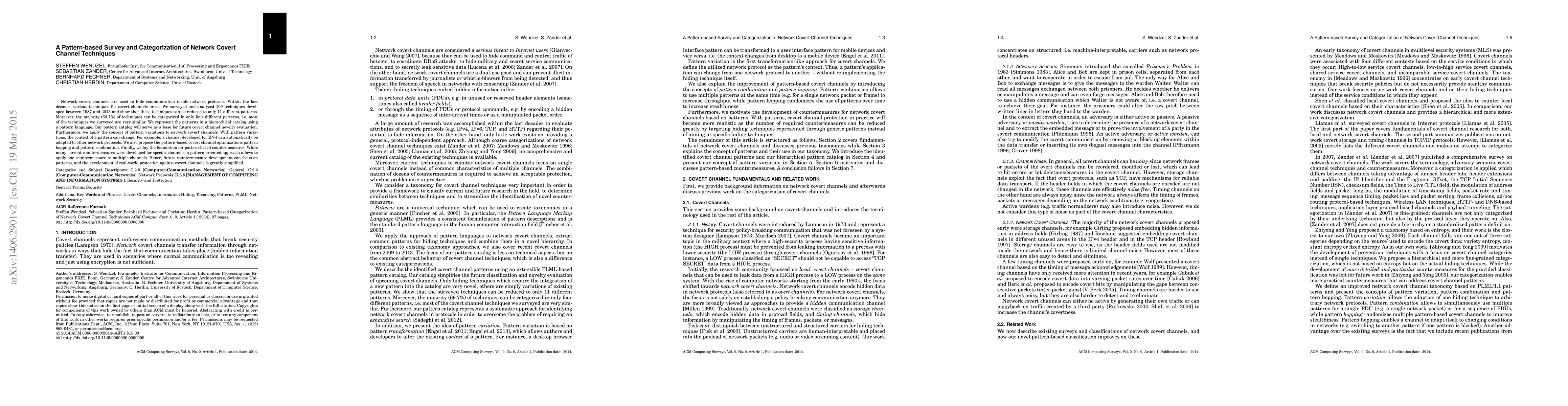 This paper surveys and categorizes 109 network covert channel techniques into 11 distinct patterns, revealing that most are variations of just four. The authors propose a hierarchical pattern catalog and introduce pattern variations, optimizations, and a pattern-based countermeasure approach to simplify future defense strategies against covert channels.