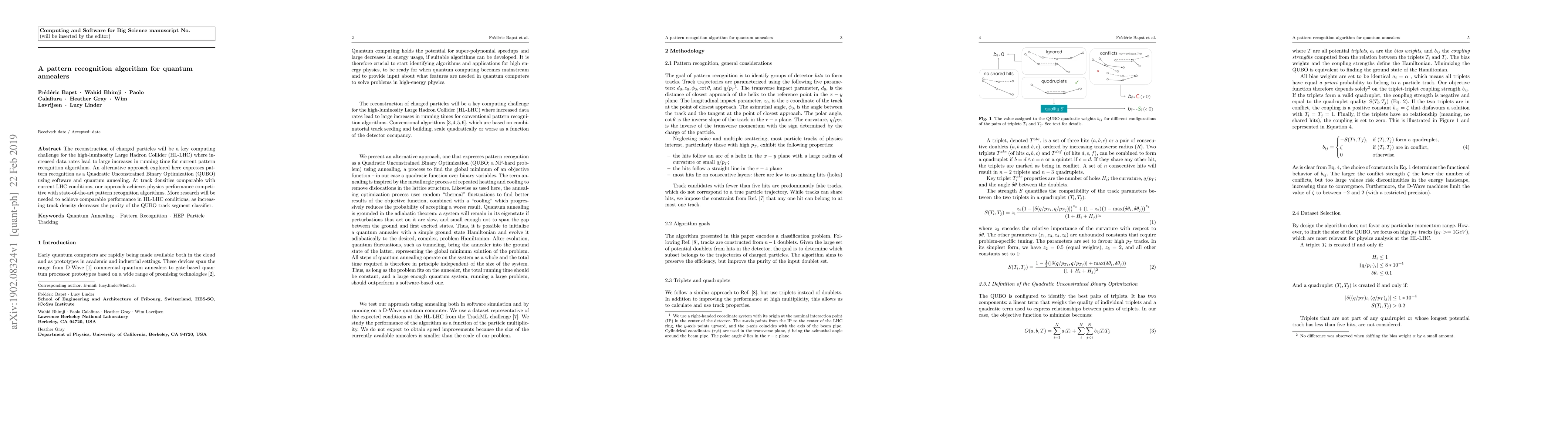 This paper proposes a Quadratic Unconstrained Binary Optimization (QUBO) approach for pattern recognition in quantum annealers to address the increased data rates at the HL-LHC. The method shows competitive performance at current LHC track densities but requires further research to match performance under HL-LHC conditions.