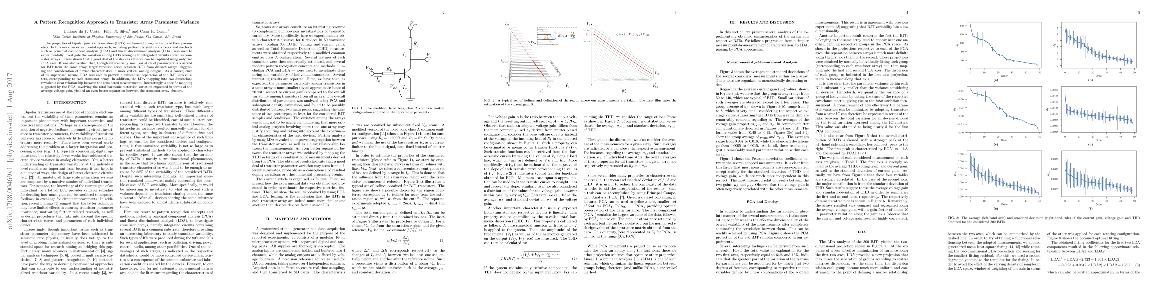 The properties of bipolar junction transistors (BJTs) are known to vary in terms of their parameters. In this work, an experimental approach, including pattern recognition concepts and methods such as principal component analysis (PCA) and linear discriminant analysis (LDA), was used to experimentally investigate the variation among BJTs belonging to integrated circuits known as transistor arrays. It was shown that a good deal of the devices variance can be captured using only two PCA axes. It was also verified that, though substantially small variation of parameters is observed for BJT from the same array, larger variation arises between BJTs from distinct arrays, suggesting the consideration of device characteristics in more critical analog designs. As a consequence of its supervised nature, LDA was able to provide a substantial separation of the BJT into clusters, corresponding to each transistor array. In addition, the LDA mapping into two dimensions revealed a clear relationship between the considered measurements. Interestingly, a specific mapping suggested by the PCA, involving the total harmonic distortion variation expressed in terms of the average voltage gain, yielded an even better separation between the transistor array clusters.