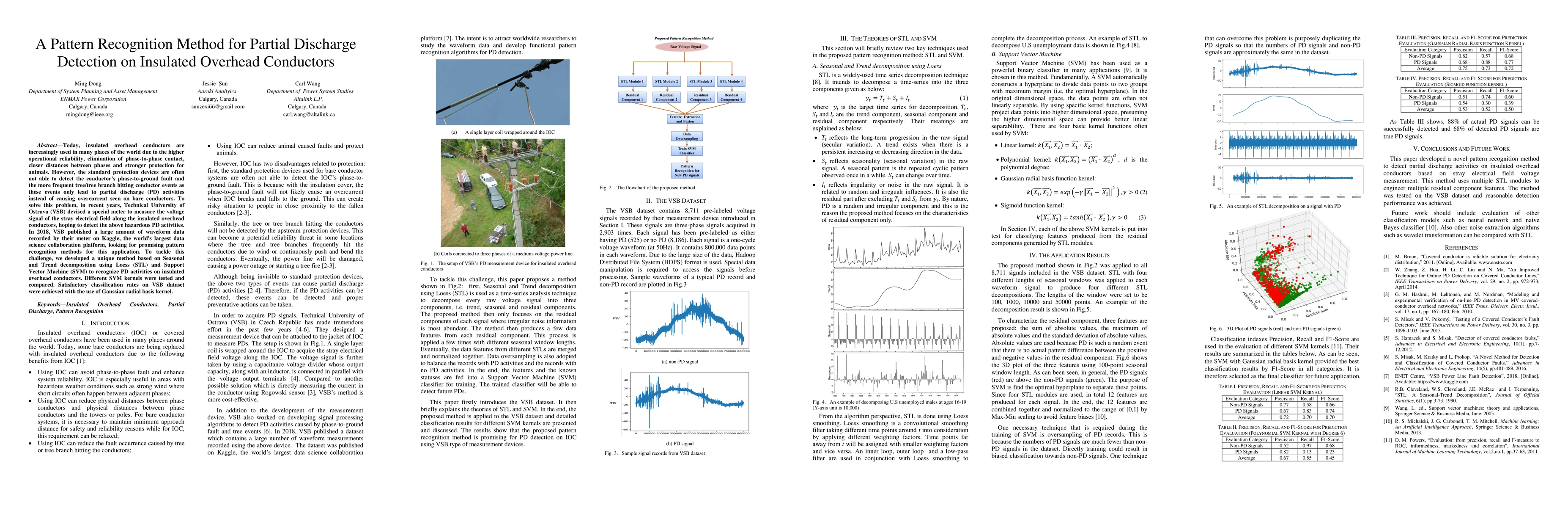 Today,insulated overhead conductors are increasingly used in many places of the world due to the higher operational reliability, elimination of phase-to-phase contact, closer distances between phases and stronger protection for animals. However, the standard protection devices are often not able to detect the conductor phase-to-ground fault and the more frequent tree/tree branch hitting conductor events as these events only lead to partial discharge (PD) activities instead of causing overcurrent seen on bare conductors. To solve this problem, in recent years, Technical University of Ostrava (VSB) devised a special meter to measure the voltage signal of the stray electrical field along the insulated overhead conductors, hoping to detect the above hazardous PD activities. In 2018, VSB published a large amount of waveform data recorded by their meter on Kaggle, the world's largest data science collaboration platform, looking for promising pattern recognition methods for this application. To tackle this challenge, we developed a unique method based on Seasonal and Trend decomposition using Loess (STL) and Support Vector Machine (SVM) to recognize PD activities on insulated overhead conductors. Different SVM kernels were tested and compared. Satisfactory classification rates on VSB dataset were achieved with the use of Gaussian radial basis kernel.