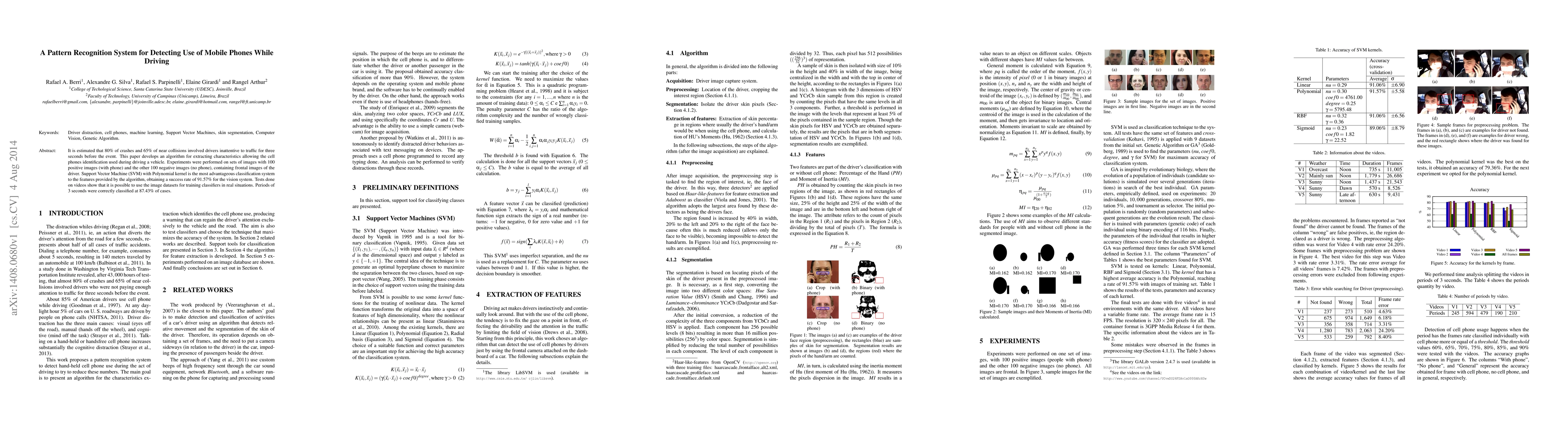 It is estimated that 80% of crashes and 65% of near collisions involved drivers inattentive to traffic for three seconds before the event. This paper develops an algorithm for extracting characteristics allowing the cell phones identification used during driving a vehicle. Experiments were performed on sets of images with 100 positive images (with phone) and the other 100 negative images (no phone), containing frontal images of the driver. Support Vector Machine (SVM) with Polynomial kernel is the most advantageous classification system to the features provided by the algorithm, obtaining a success rate of 91.57% for the vision system. Tests done on videos show that it is possible to use the image datasets for training classifiers in real situations. Periods of 3 seconds were correctly classified at 87.43% of cases.