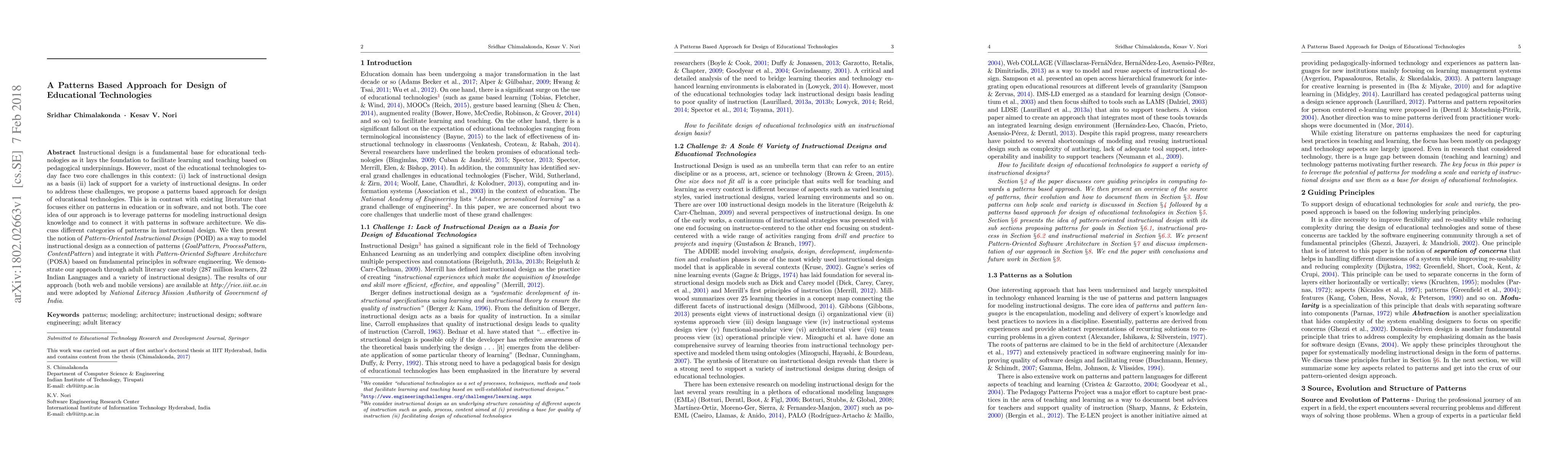 This paper proposes a patterns-based approach to design educational technologies, addressing the lack of instructional design and support for diverse instructional designs. It introduces Pattern-Oriented Instructional Design (POID) to model instructional design knowledge and integrates it with Pattern-Oriented Software Architecture (POSA) for effective software engineering principles application. The approach is demonstrated through an adult literacy case study in India.