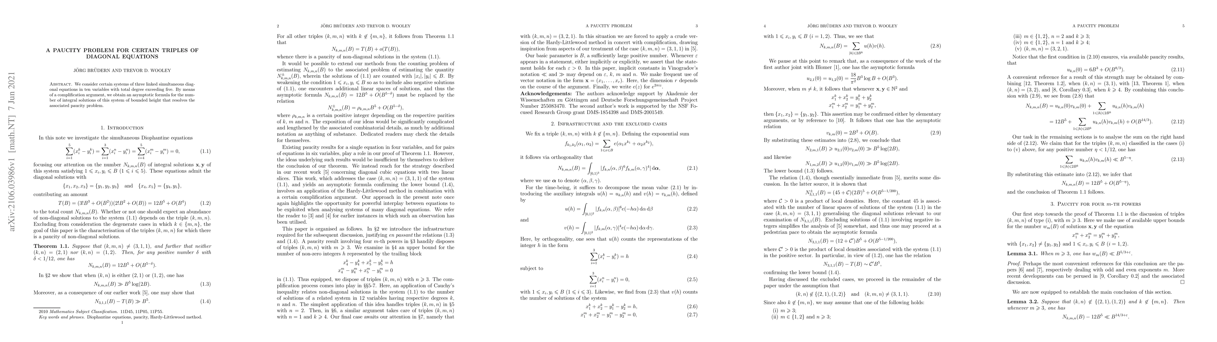 This paper solves a 'paucity problem' for certain systems of three linked simultaneous diagonal equations in ten variables, finding an asymptotic formula for integral solutions of bounded height. The solution resolves the associated problem by providing insight into the number of possible solutions.