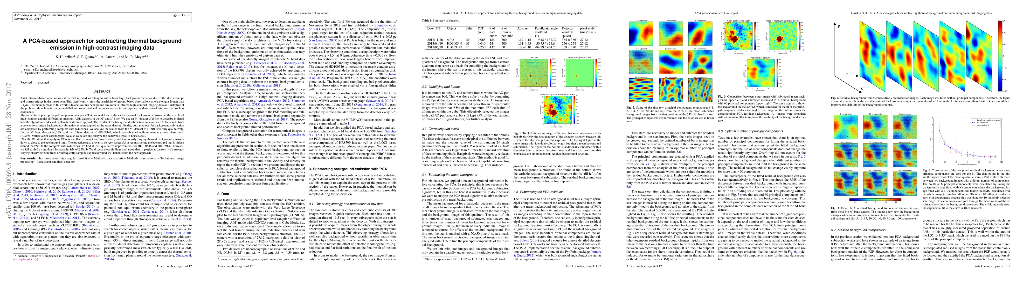 This paper presents a Principal Component Analysis (PCA)-based method to subtract thermal background emission in high-contrast infrared imaging data, improving faint source detection like exoplanets. While the method shows success in reducing background noise and reconstructing hidden background, significant signal-to-noise ratio (S/N) improvements were only qualitatively observed in certain datasets, especially those with varying observing conditions.