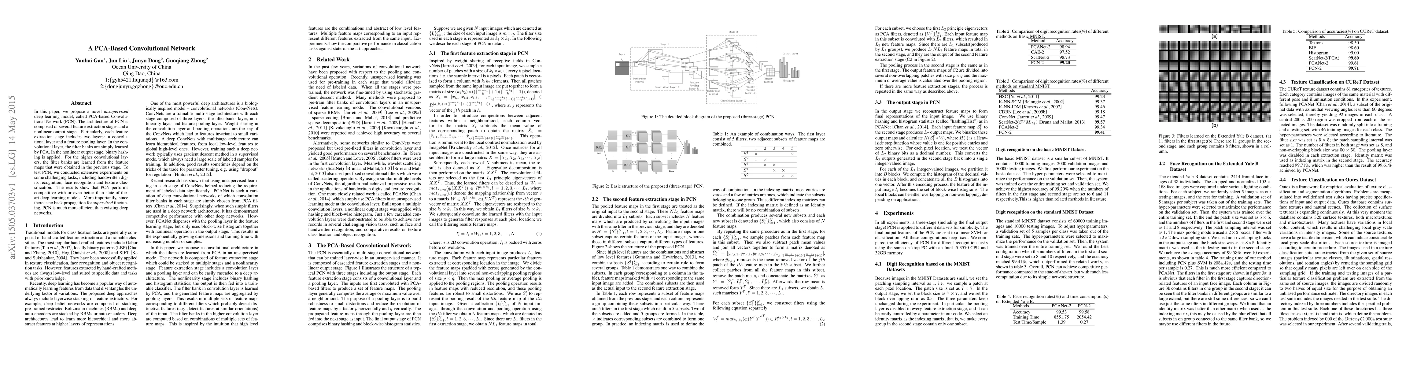 In this paper, we propose a novel unsupervised deep learning model, called PCA-based Convolutional Network (PCN). The architecture of PCN is composed of several feature extraction stages and a nonlinear output stage. Particularly, each feature extraction stage includes two layers: a convolutional layer and a feature pooling layer. In the convolutional layer, the filter banks are simply learned by PCA. In the nonlinear output stage, binary hashing is applied. For the higher convolutional layers, the filter banks are learned from the feature maps that were obtained in the previous stage. To test PCN, we conducted extensive experiments on some challenging tasks, including handwritten digits recognition, face recognition and texture classification. The results show that PCN performs competitive with or even better than state-of-the-art deep learning models. More importantly, since there is no back propagation for supervised finetuning, PCN is much more efficient than existing deep networks.