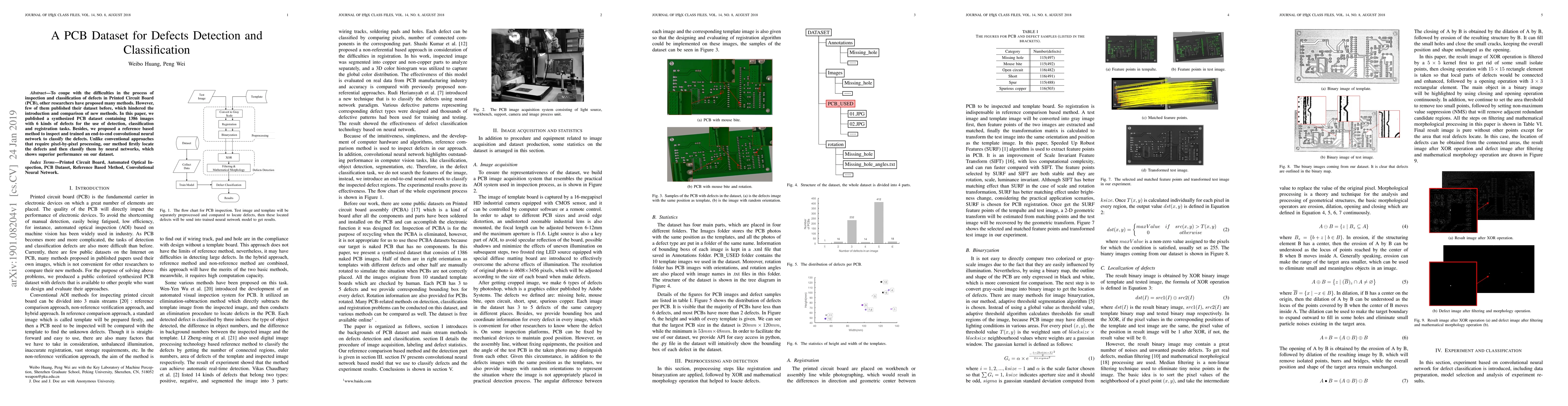 This paper introduces a synthesized PCB dataset with 1386 images and six types of defects to facilitate defect detection and classification. It also proposes a reference-based method and an end-to-end CNN for defect classification, demonstrating superior performance by first locating defects before classification.
