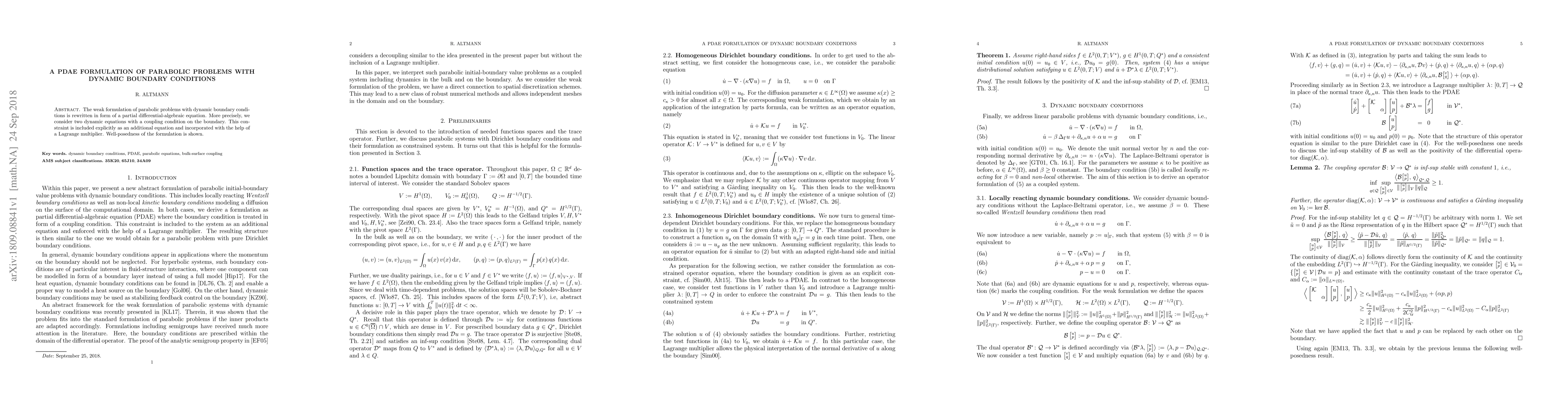 This paper reformulates parabolic problems with dynamic boundary conditions as a partial differential-algebraic equation (PDAE). It introduces a coupling condition on the boundary, explicitly included as an additional equation using a Lagrange multiplier, and demonstrates the well-posedness of the resulting formulation.