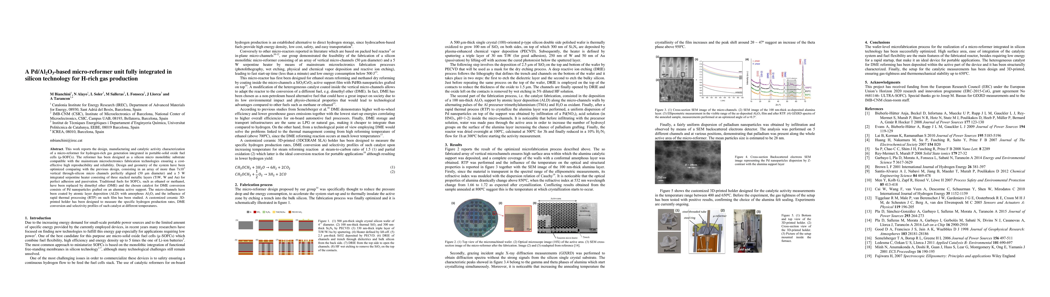 This research presents a silicon micro-reformer integrated with u-SOFCs for hydrogen production, featuring optimized micro-channels and a Pd/Al2O3 catalyst for DME conversion. The design ensures high reproducibility and reliability through silicon microelectronics fabrication compatibility.