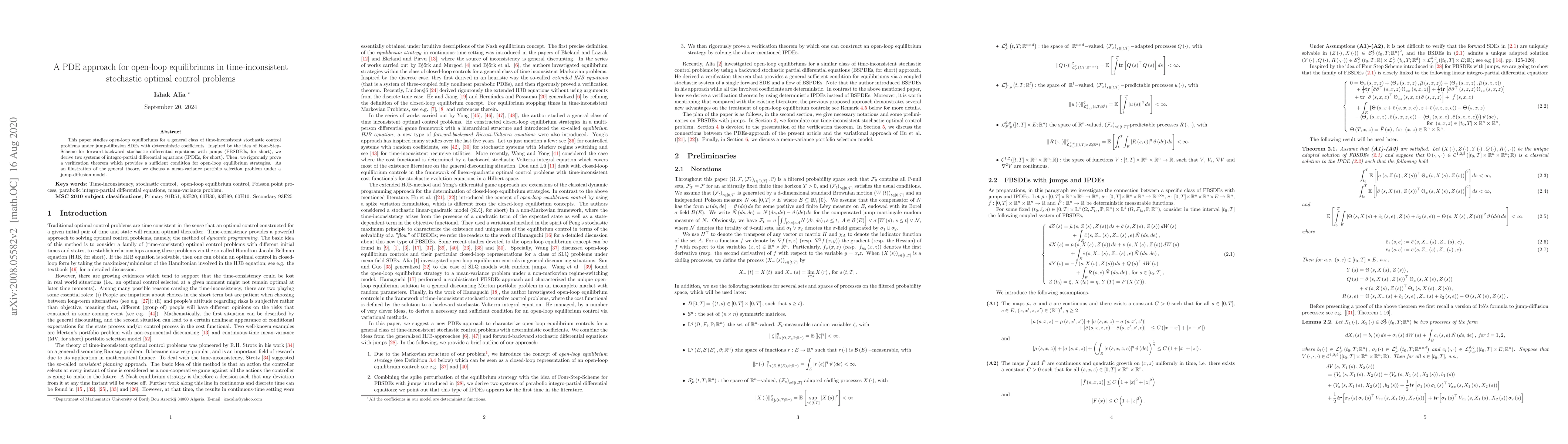 This paper develops a PDE approach to find open-loop equilibrium strategies for time-inconsistent stochastic control problems governed by jump-diffusion SDEs. It derives two IPDE systems and proves a verification theorem for open-loop equilibrium strategies, illustrated through a mean-variance portfolio selection problem.