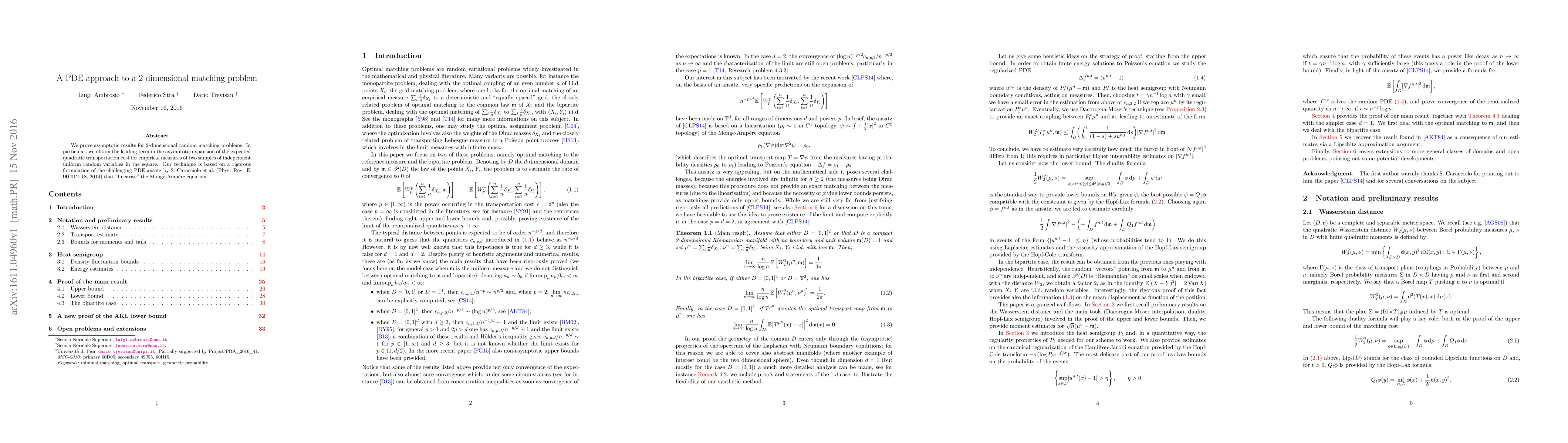 Researchers prove asymptotic results for 2-dimensional random matching problems using a novel approach to the Monge-Amp\