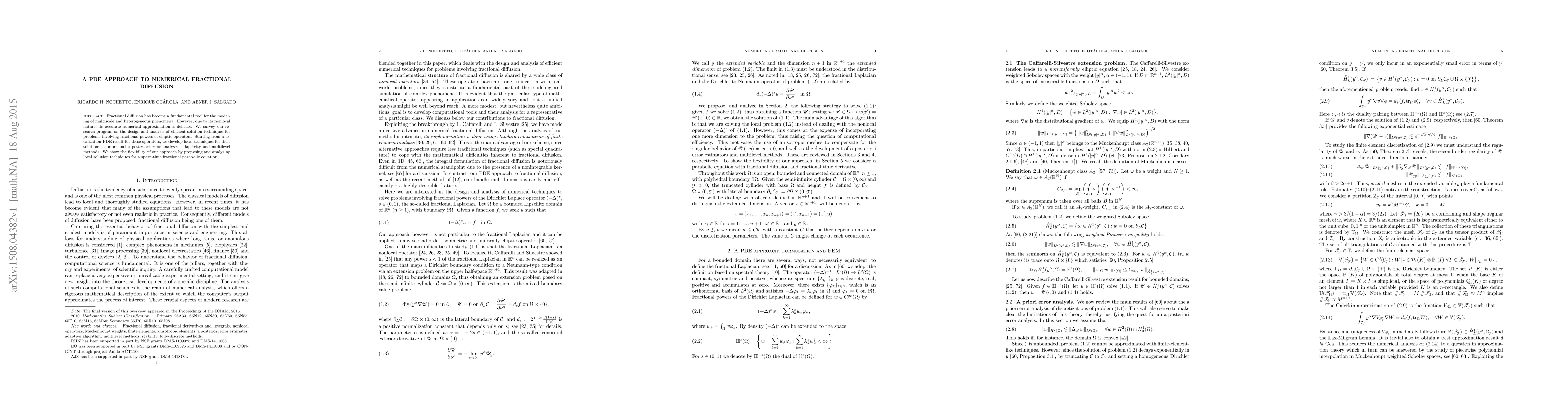 Fractional diffusion has become a fundamental tool for the modeling of multiscale and heterogeneous phenomena. However, due to its nonlocal nature, its accurate numerical approximation is delicate. We survey our research program on the design and analysis of efficient solution techniques for problems involving fractional powers of elliptic operators. Starting from a localization PDE result for these operators, we develop local techniques for their solution: a priori and a posteriori error analyses, adaptivity and multilevel methods. We show the flexibility of our approach by proposing and analyzing local solution techniques for a space-time fractional parabolic equation.