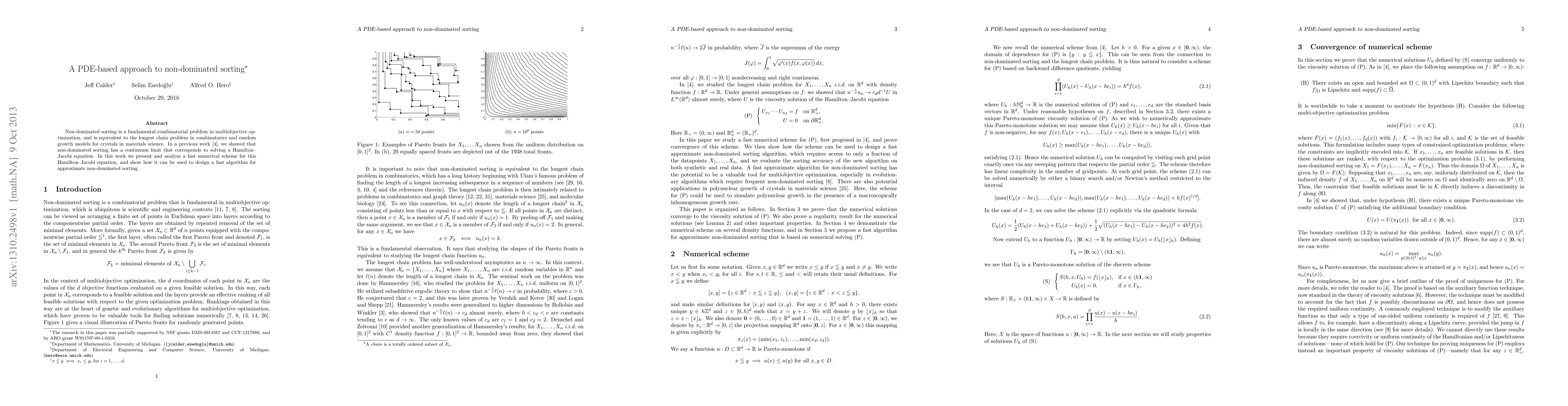 This paper proposes a PDE-based numerical scheme to solve a Hamilton-Jacobi equation derived from the continuum limit of non-dominated sorting, and demonstrates its application in designing an efficient algorithm for approximate non-dominated sorting in multiobjective optimization.