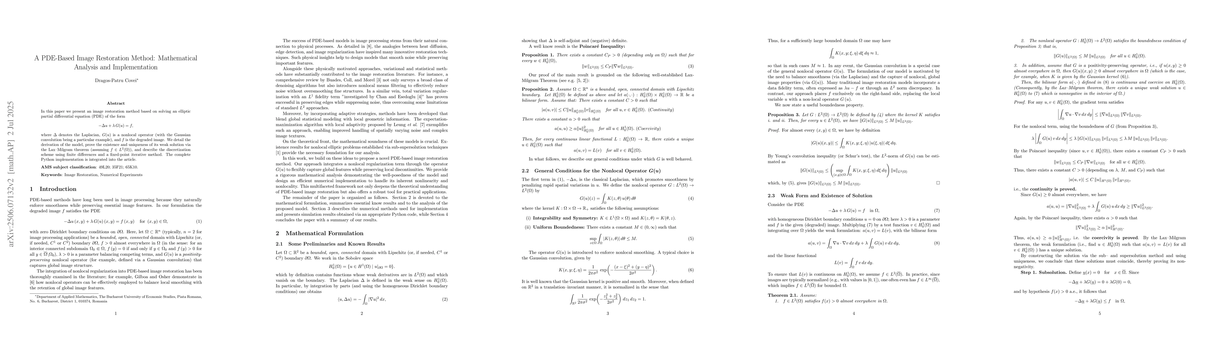 This paper proposes a novel image restoration method based on solving an elliptic partial differential equation, demonstrating its effectiveness through mathematical analysis and implementation in Python.