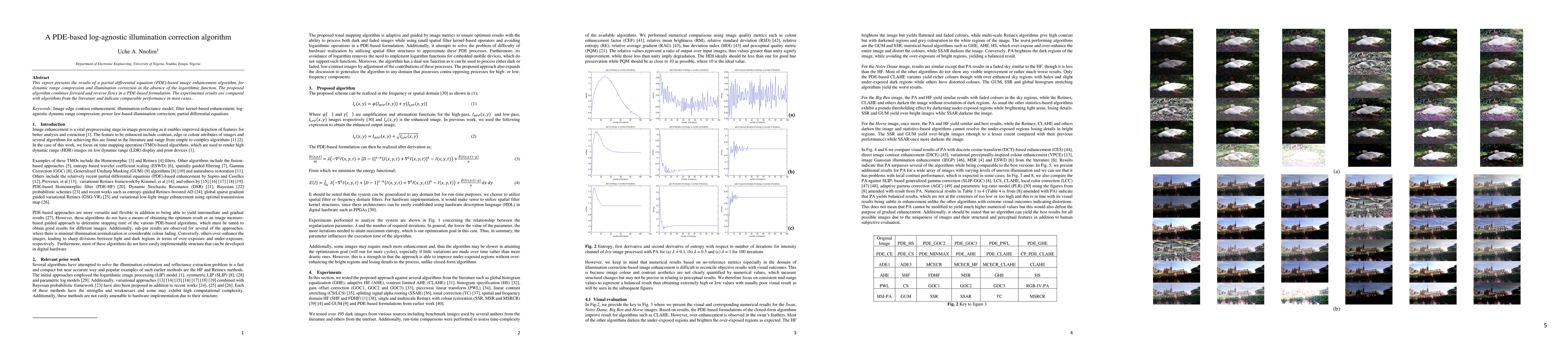 Researchers developed a log-agnostic image enhancement algorithm using partial differential equations for dynamic range compression and illumination correction, showing comparable performance to existing algorithms in most cases.