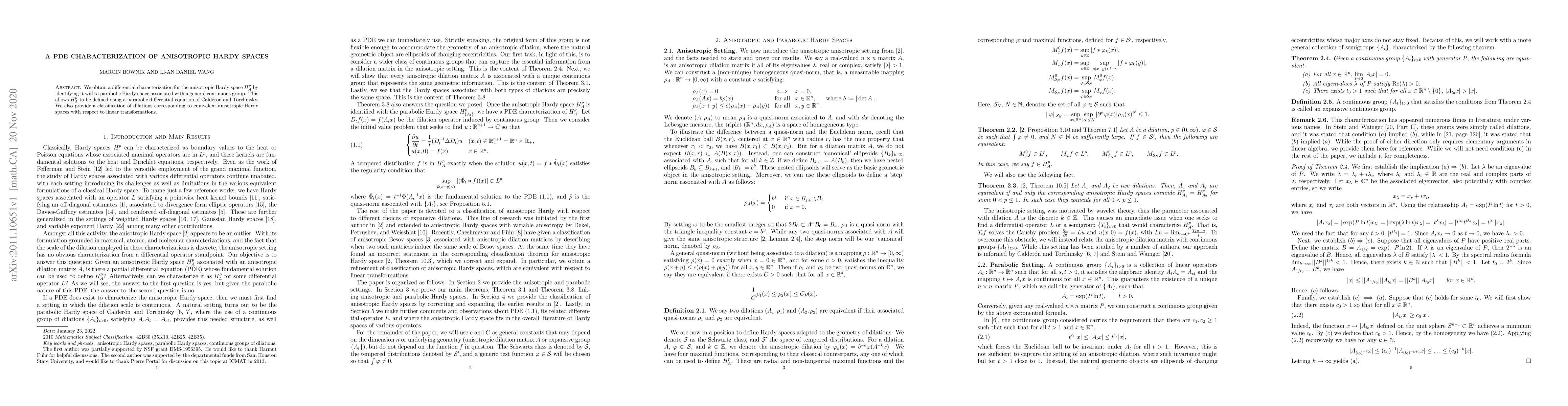 We obtain a differential characterization for the anisotropic Hardy space $H_A^p$ by identifying it with a parabolic Hardy space associated with a general continuous group. This allows $H_A^p$ to be defined using a parabolic differential equation of Calderon and Torchinsky. We also provide a classification of dilations corresponding to equivalent anisotropic Hardy spaces with respect to linear transformations.
