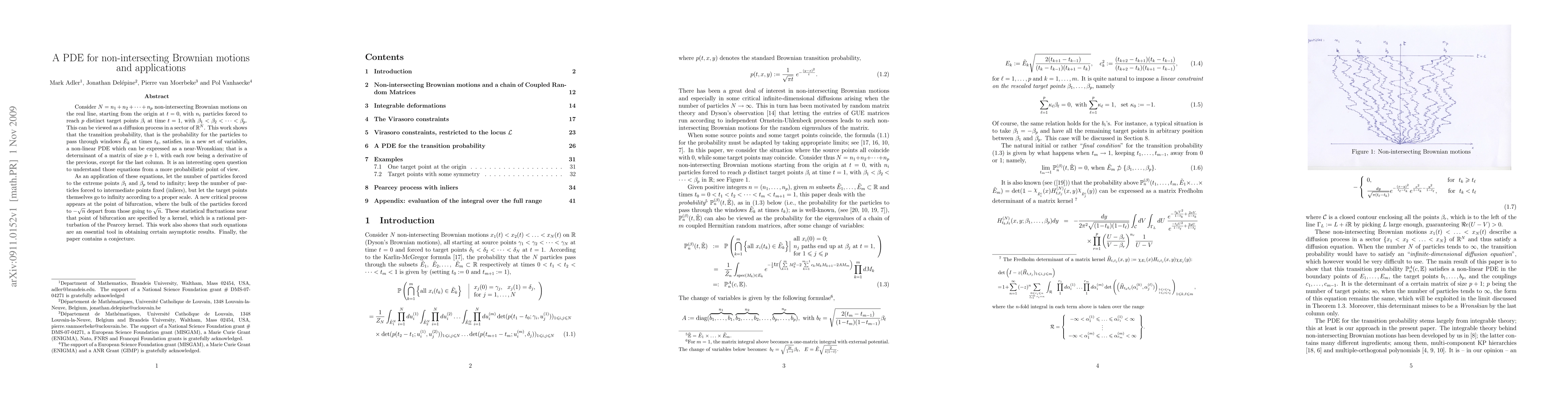 Consider non-intersecting Brownian motions on the real line, starting from the origin at t=0, with a number of particles forced to reach p distinct target points at time t=1. This work shows that the transition probability, that is the probability for the particles to pass through windows E_k at times t_k, satisfies, in a new set of variables, a non-linear PDE which can be expressed as a near-Wronskian; that is a determinant of a matrix of size p+1, with each row being a derivative of the previous, except for the last column. It is an interesting open question to understand those equations from a more probabilistic point of view. As an application of these equations, let the number of particles forced to the extreme target points (the first and the last one) tend to infinity; keep the number of particles forced to intermediate target points fixed (inliers), but let the target points themselves go to infinity according to a proper scale. A new critical process appears at the point of bifurcation, where the bulk of the particles forced to the first target point depart from those going to the last target point. These statistical fluctuations near that point of bifurcation are specified by a kernel, which is a rational perturbation of the Pearcey kernel. Finally, the paper contains a conjecture.