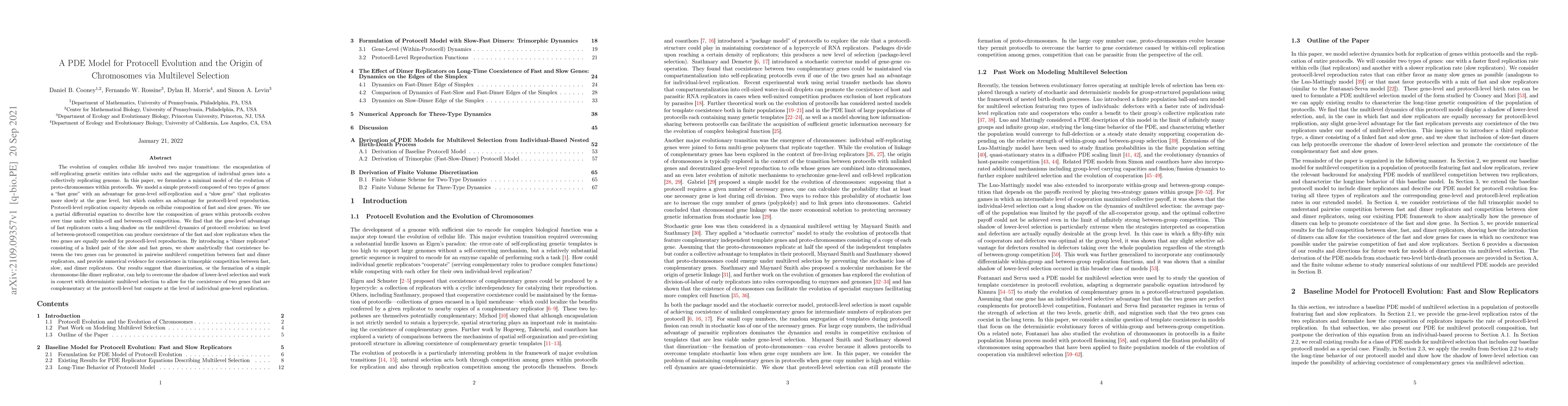 This paper develops a PDE model to explore protocell evolution and the origin of chromosomes, focusing on the coexistence of fast and slow genes within protocells. It finds that multilevel selection dynamics can promote coexistence through the formation of dimer replicators, suggesting that chromosome-like structures may facilitate gene coexistence.