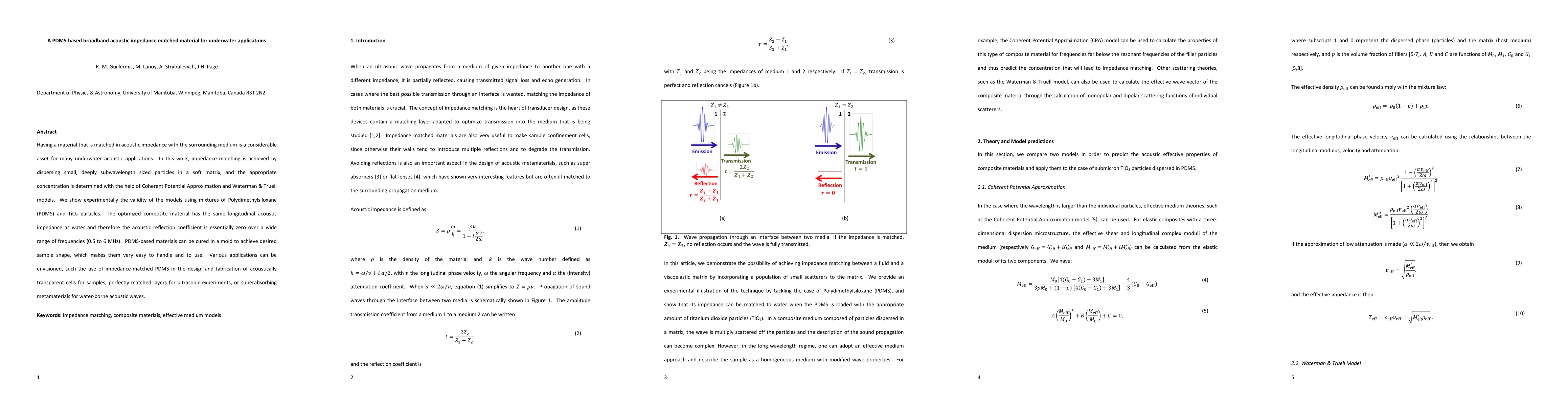 This research develops a broadband acoustic impedance matched material using PDMS and TiO2 particles, achieving zero reflection over 0.5 to 6 MHz. The material's design leverages theoretical models and is easily moldable for practical applications like acoustically transparent cells and superabsorbing metamaterials.