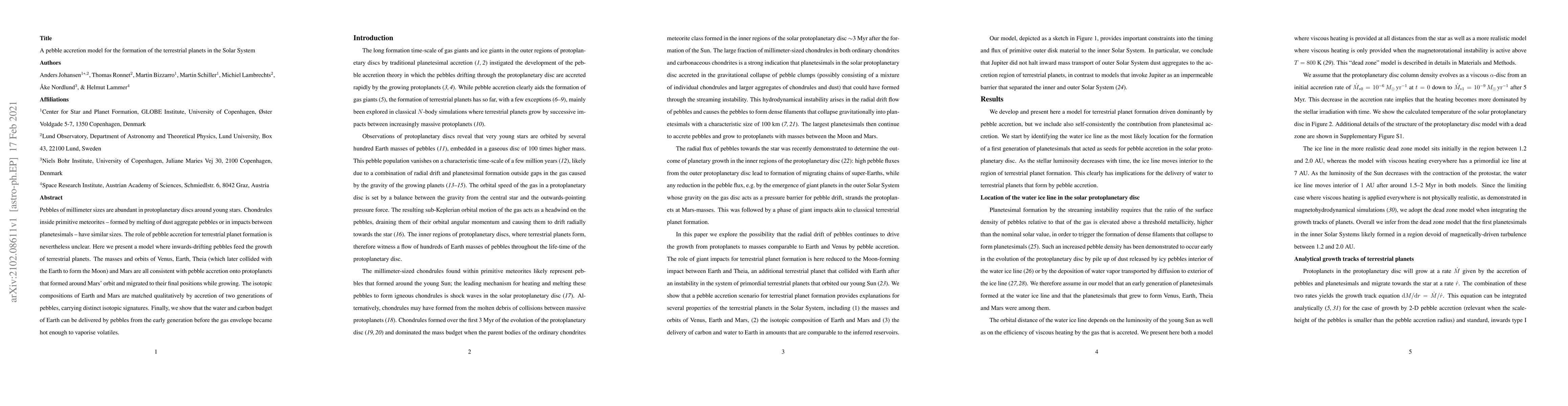 This paper proposes a pebble accretion model for the formation of terrestrial planets, suggesting that inward-drifting millimeter-sized pebbles in protoplanetary discs contribute to the growth of planets like Venus, Earth, Theia, and Mars. The model aligns with the observed masses, orbits, and isotopic compositions of these planets.