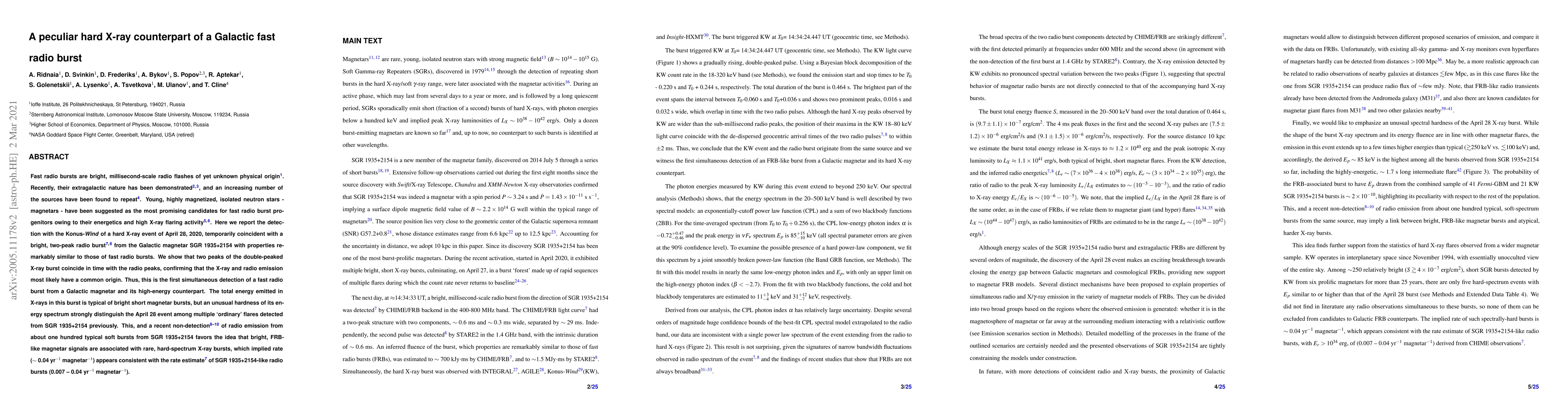 This paper reports the first simultaneous detection of a fast radio burst (FRB) from a Galactic magnetar, SGR~1935+2154, and its hard X-ray counterpart, revealing a rare, hard-spectrum X-ray burst coinciding with the radio peaks. This discovery supports the magnetar hypothesis for FRBs and suggests a rare event rate for such bursts.