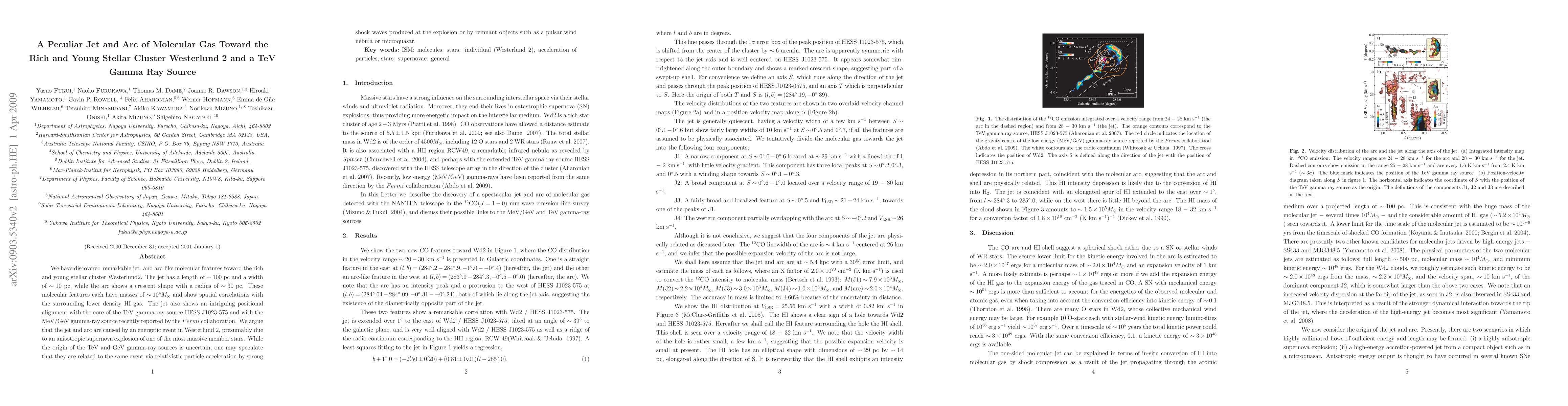 This paper reports the discovery of a jet and arc of molecular gas in Westerlund 2, aligned with TeV and MeV/GeV gamma-ray sources, suggesting they may result from an energetic event like an anisotropic supernova explosion from a massive star. The origin of the gamma-ray sources remains uncertain but could be linked to the same event via shock waves or remnant objects.