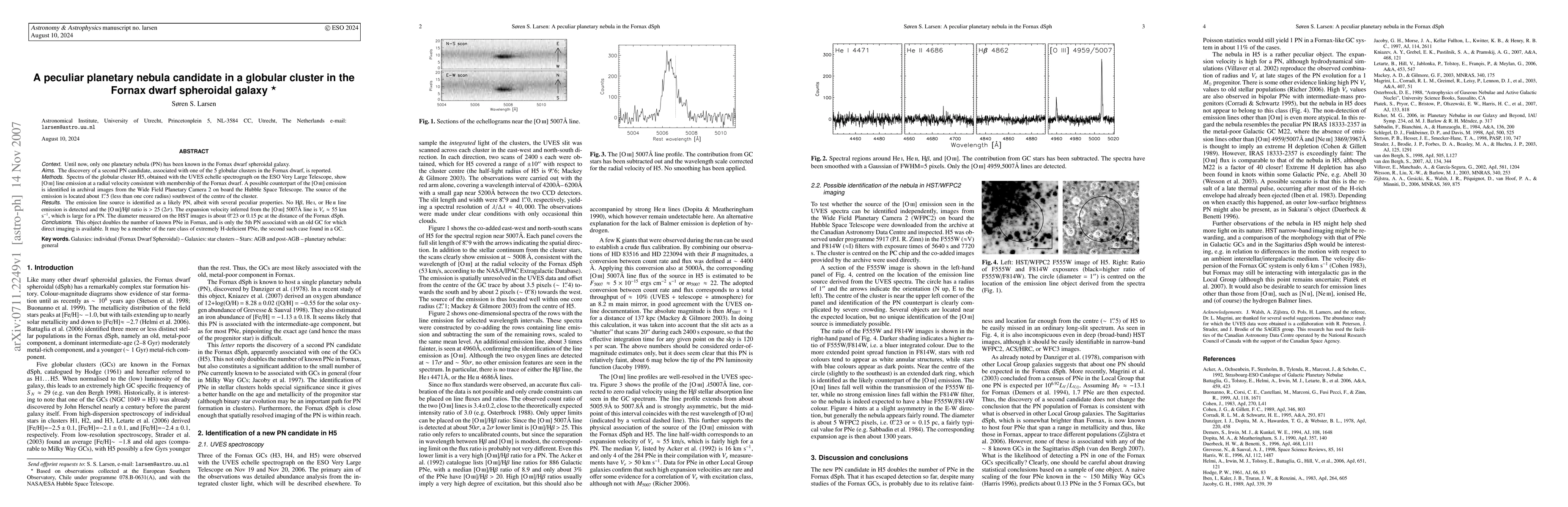 CONTEXT: Until now, only one planetary nebula (PN) has been known in the Fornax dwarf spheroidal galaxy. AIMS: The discovery of a second PN candidate, associated with one of the 5 globular clusters in the Fornax dwarf, is reported. METHODS: Spectra of the globular cluster H5, obtained with the UVES echelle spectrograph on the ESO Very Large Telescope, show [O III] line emission at a radial velocity consistent with membership of the Fornax dwarf. A possible counterpart of the [O III] emission is identified in archival images from the Wide Field Planetary Camera 2 on board the Hubble Space Telescope. The source of the emission is located about 1.5" (less than one core radius) southwest of the centre of the cluster. RESULTS: The emission line source is identified as a likely PN, albeit with several peculiar properties. No Hbeta, He I, or He II line emission is detected and the [O III]/Hbeta ratio is >25 (2 sigma). The expansion velocity inferred from the [O III] 5007 AA line is about 55 km/s, which is large for a PN. The diameter measured on the HST images is about 0.23" or 0.15 pc at the distance of the Fornax dSph. CONCLUSIONS: This object doubles the number of known PNe in Fornax, and is only the 5th PN associated with an old GC for which direct imaging is available. It may be a member of the rare class of extremely H-deficient PNe, the second such case found in a GC.