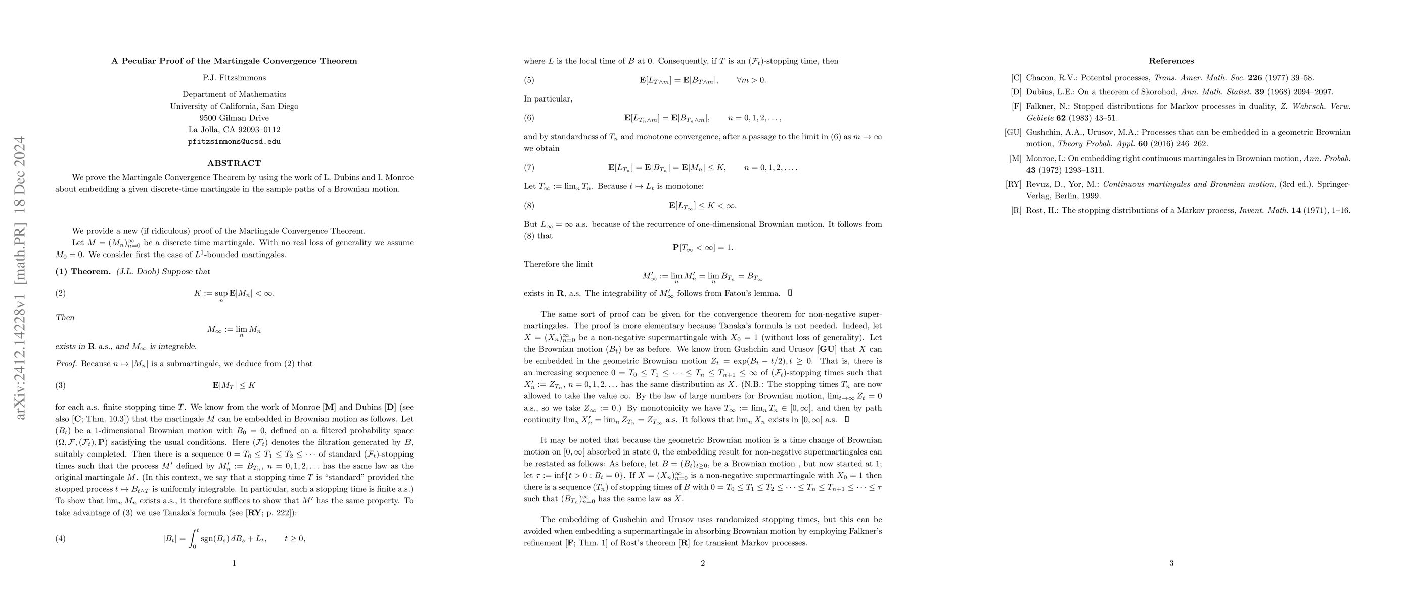 Summary: This paper proves the Martingale Convergence Theorem through the embedding of discrete-time martingales into the sample paths of Brownian motion, utilizing prior work by L. Dubins and I. Monroe. The novel approach leverages advanced stochastic processes theory.