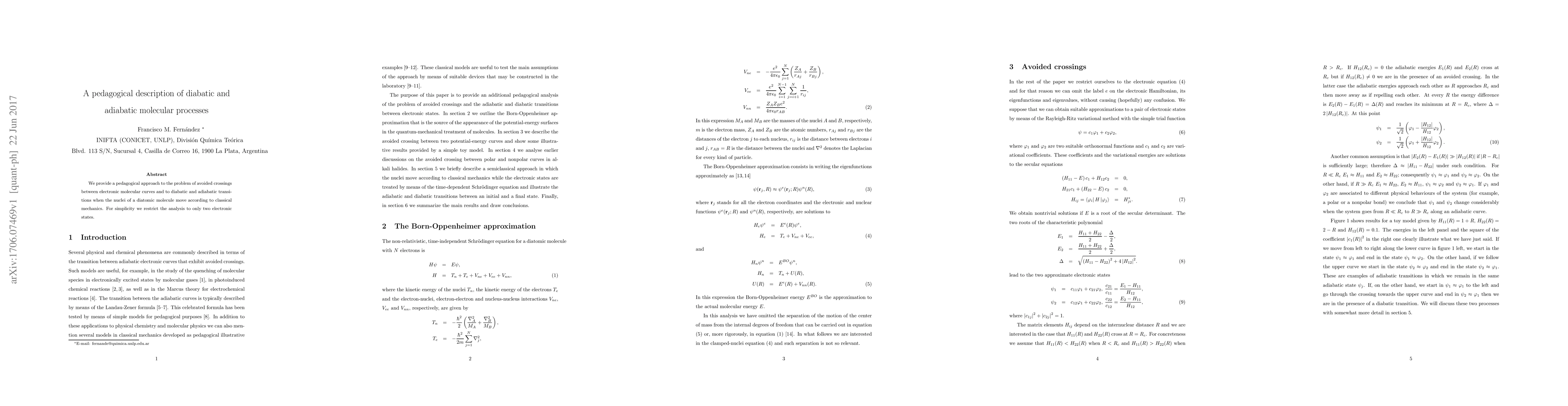 This paper offers a simplified pedagogical explanation of diabatic and adiabatic transitions in molecular processes, focusing on avoided crossings between electronic molecular states and the movement of nuclei in a diatomic molecule. It restricts the analysis to interactions between just two electronic states.