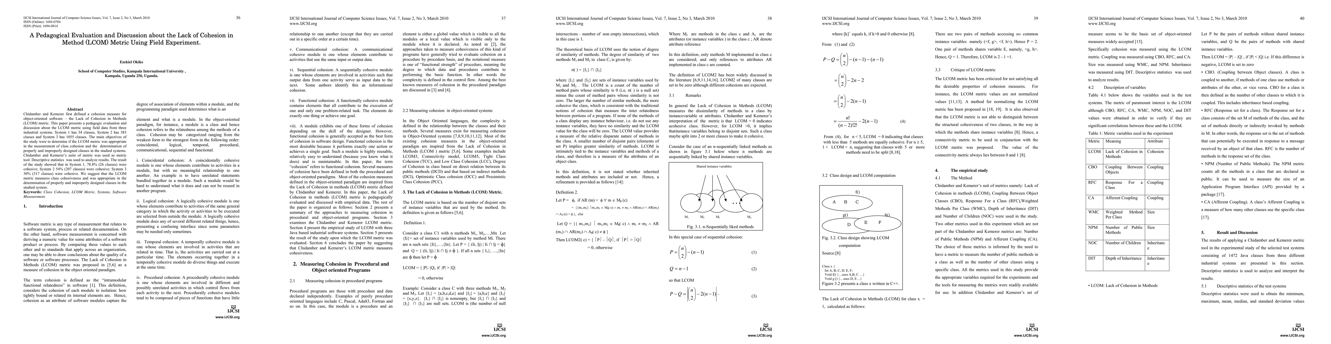 Chidamber and Kemerer first defined a cohesion measure for object-oriented software - the Lack of Cohesion in Methods (LCOM) metric. This paper presents a pedagogic evaluation and discussion about the LCOM metric using field data from three industrial systems. System 1 has 34 classes, System 2 has 383 classes and System 3 has 1055 classes. The main objectives of the study were to determine if the LCOM metric was appropriate in the measurement of class cohesion and the determination of properly and improperly designed classes in the studied systems. Chidamber and Kemerer's suite of metric was used as metric tool. Descriptive statistics was used to analyze results. The result of the study showed that in System 1, 78.8% (26 classes) were cohesive; System 2 54% (207 classes) were cohesive; System 3 30% (317 classes) were cohesive. We suggest that the LCOM metric measures class cohesiveness and was appropriate in the determination of properly and improperly designed classes in the studied system.