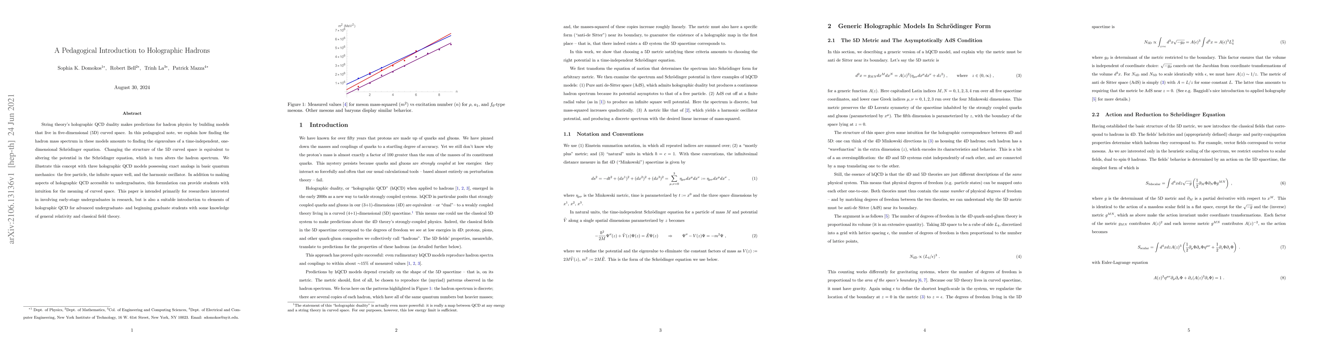 This paper offers a pedagogical introduction to holographic QCD, explaining how string theory's holographic duality uses five-dimensional curved space models to predict hadron physics. It simplifies the complex problem of finding hadron masses by equating it to solving a one-dimensional Schrödinger equation, using examples from basic quantum mechanics to illustrate the concept.