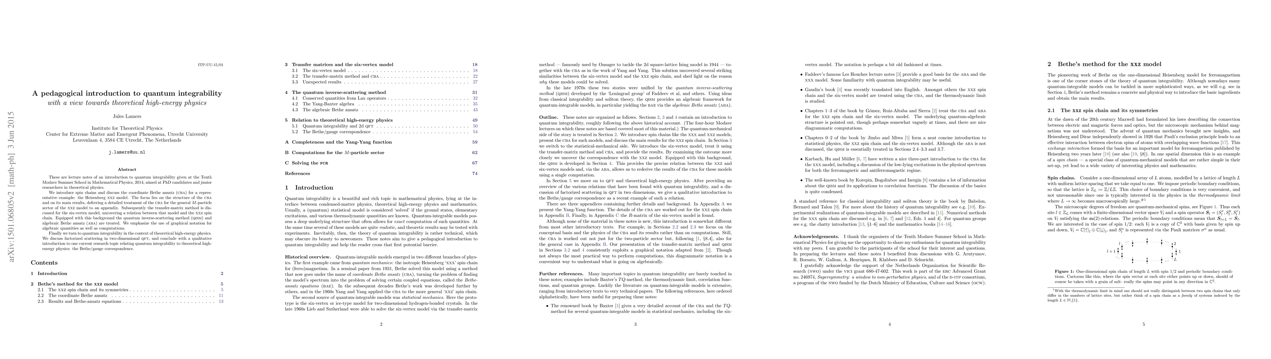 This paper provides lecture notes introducing quantum integrability, focusing on spin chains and the coordinate Bethe ansatz for the Heisenberg XXZ model, and the transfer-matrix method for the six-vertex model. It concludes with a discussion on quantum integrability's relevance in theoretical high-energy physics, including the Bethe/gauge correspondence.