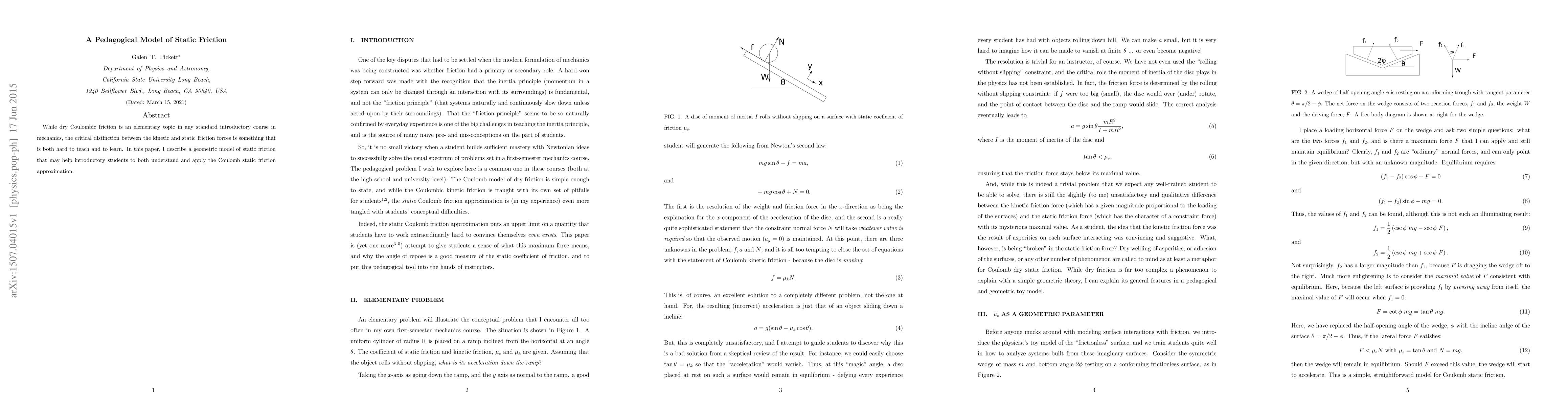 This paper presents a geometric model to clarify the distinction between kinetic and static friction for introductory mechanics students, aiming to enhance their understanding and application of Coulomb static friction. The model offers a new perspective to teach this often confusing concept.