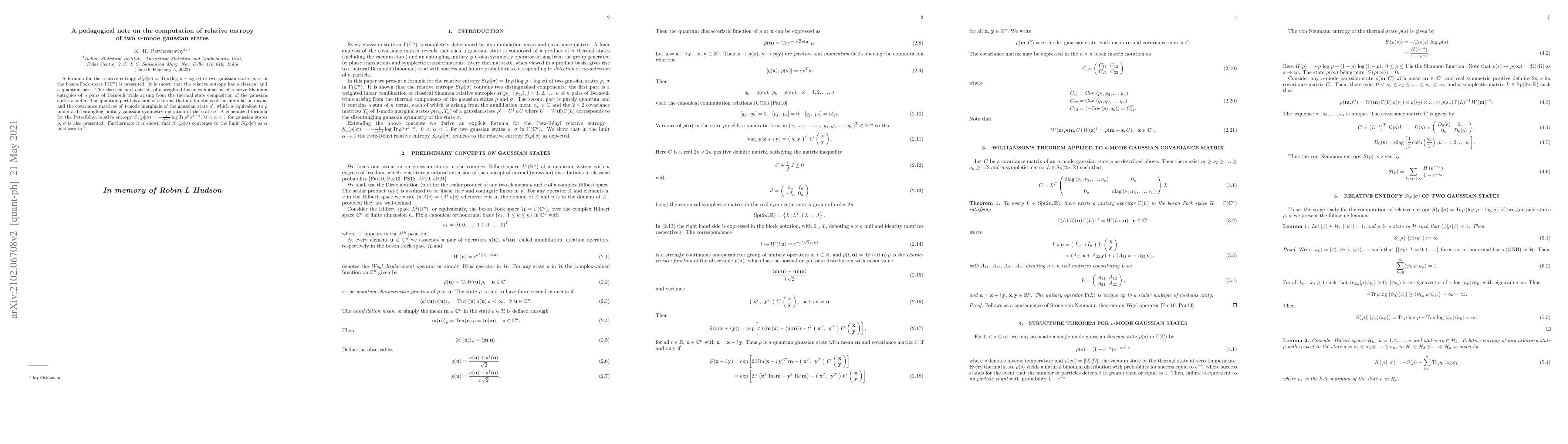 Researchers developed a formula to calculate the relative entropy of two n-mode Gaussian states, showing it has both classical and quantum parts. The formula also extends to a generalized Petz-Renyi relative entropy for Gaussian states.