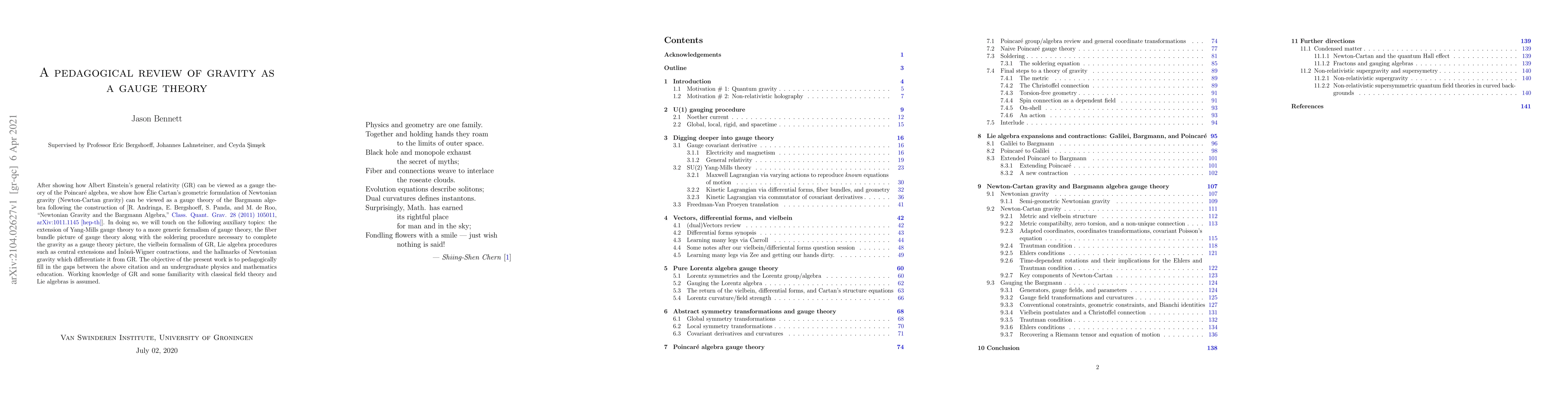 This paper reviews how general relativity can be framed as a gauge theory of the Poincaré algebra and extends this perspective to Newtonian gravity as a gauge theory of the Bargmann algebra, aiming to bridge the conceptual gaps for undergraduate physics and mathematics students. It covers foundational topics like the fiber bundle picture, the vielbein formalism, and Lie algebra procedures.