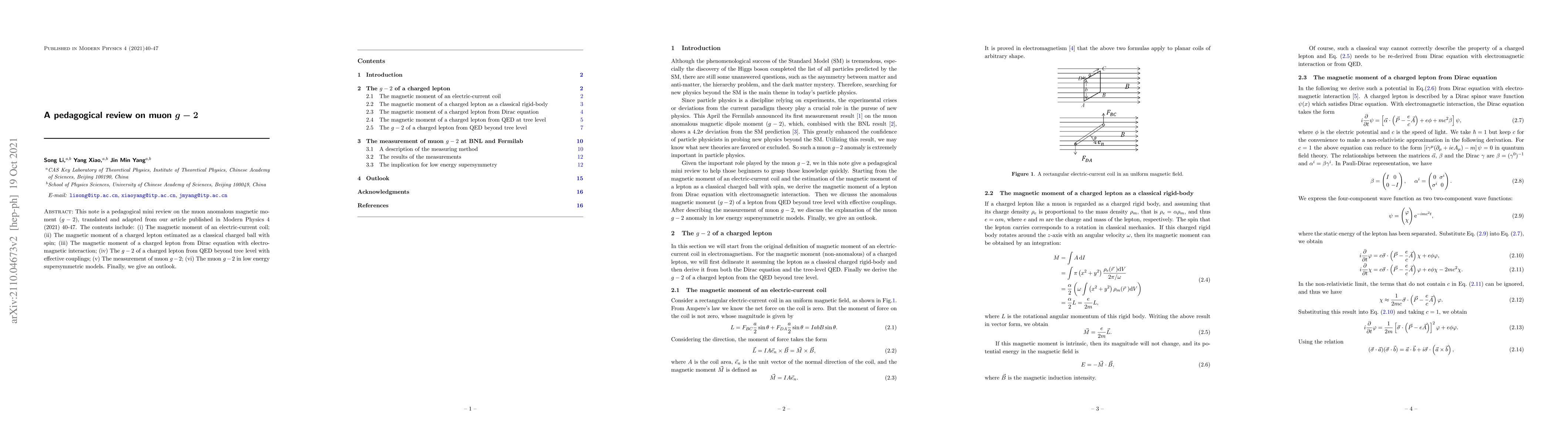 This note is a pedagogical mini review on the muon anomalous magnetic moment ($g-2$), translated and adapted from our article published in Modern Physics 4 (2021) 40-47. The contents include: (i) The magnetic moment of an electric-current coil; (ii) The magnetic moment of a charged lepton estimated as a classical charged ball with spin; (iii) The magnetic moment of a charged lepton from Dirac equation with electromagnetic interaction; (iv) The $g-2$ of a charged lepton from QED beyond tree level with effective couplings; (v) The measurement of muon $g-2$; (vi) The muon $g-2$ in low energy supersymmetric models. Finally, we give an outlook.
