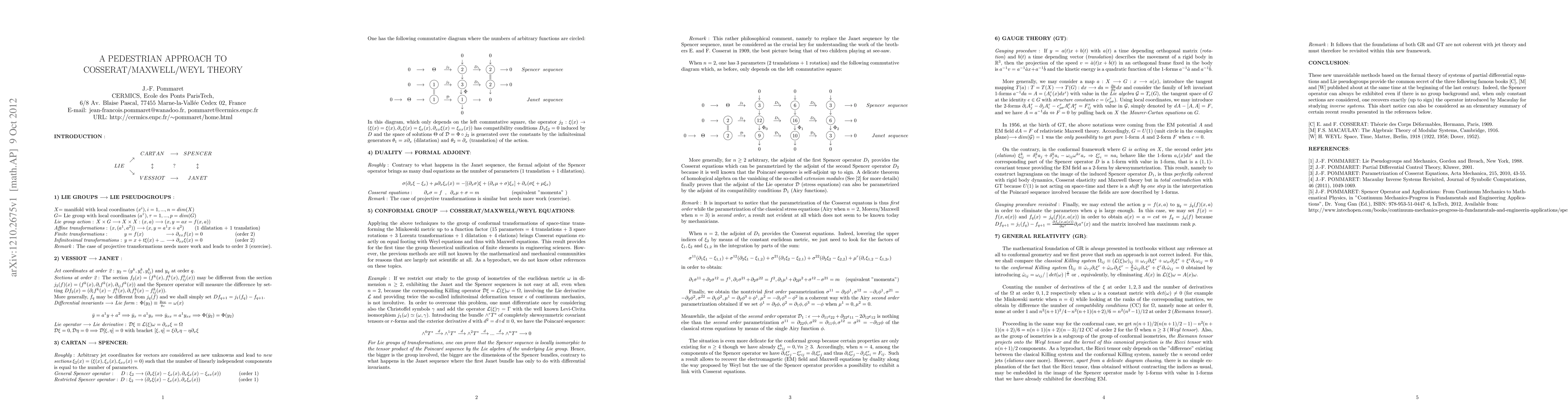 The purpose of this short notice is to present an elementary summary of a few recent results obtained through the application of the formal theory of systems of partial differential equations and Lie pseudo groups to engineering (elasticity theory, electromagnetism, coupling phenomena) and mathematical (gauge theory, general relativity) along the following scheme: 1) Lie groups of transformations may be considered as Lie pseudo groups of transformations but no action type method can be used as parameters never appear any longer. 2) The work of Cartan is superseded by the use of the canonical Spencer sequence while the work of Vessiot is superseded by the use of the canonical Janet sequence but the link between these two sequences and thus these two works is not known today. 3)Using duality theory, the formal adjoint of the Spencer operator for the conformal group of transformations of space-time provides the Cosserat equations, the Maxwell equations and the Weyl equations on equal footing but such a result leads to deep contradictions. Accordingly, the results thus obtained prove that the foundations of engineering and mathematical physics must be revisited within the framework of jet theory though striking it may look like for established theories.