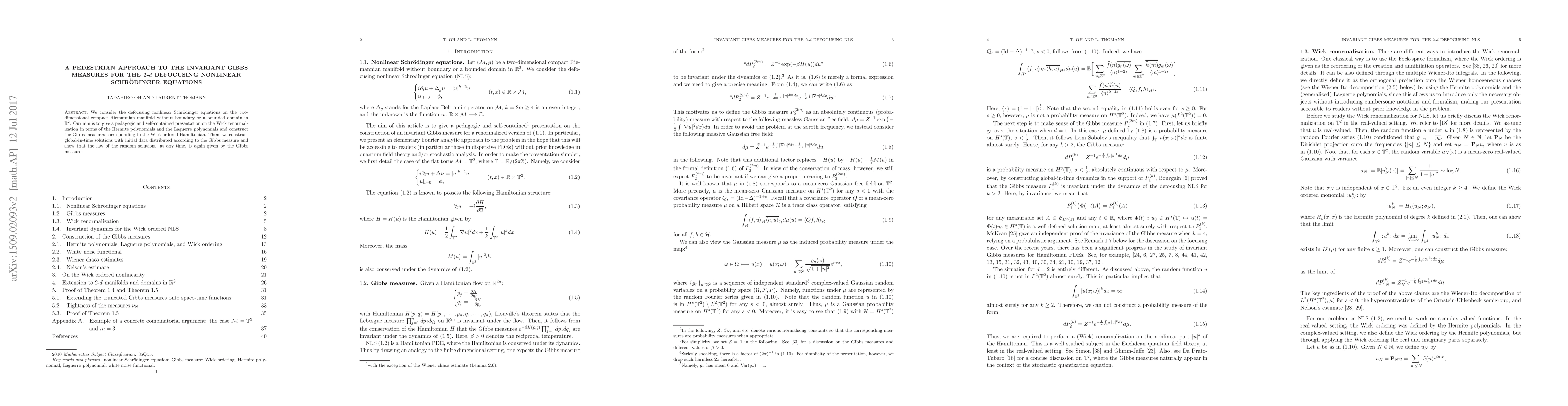 We consider the defocusing nonlinear Schr\"odinger equations on the two-dimensional compact Riemannian manifold without boundary or a bounded domain in $\R^2$. Our aim is to give a pedagogic and self-contained presentation on the Wick renormalization in terms of the Hermite polynomials and the Laguerre polynomials and construct the Gibbs measures corresponding to the Wick ordered Hamiltonian. Then, we construct global-in-time solutions with initial data distributed according to the Gibbs measure and show that the law of the random solutions, at any time, is again given by the Gibbs measure.